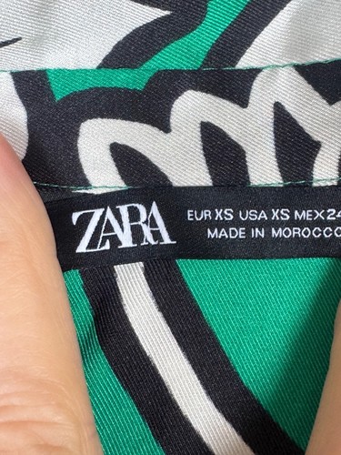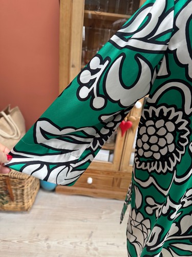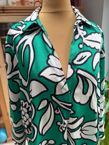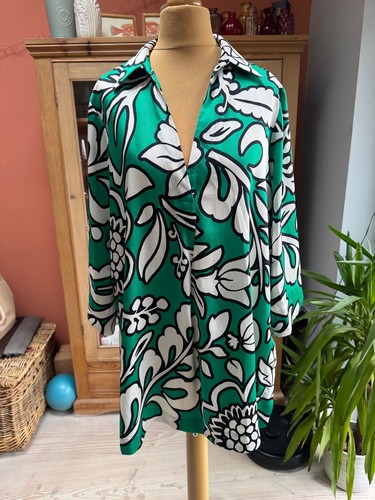 A wonderful blouse/tunic top from ZARA, in a silky satin fabric, with collar detail and side splits in a vibrant green, black and ivory pattern - really gorgeous on!