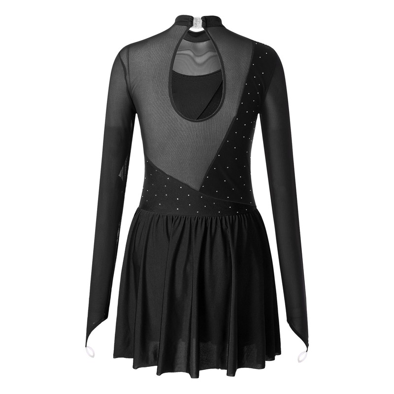 Women Glitter Figure Ice Skating Dress Mesh Long Sleeve Ballet Leotard Dancewear