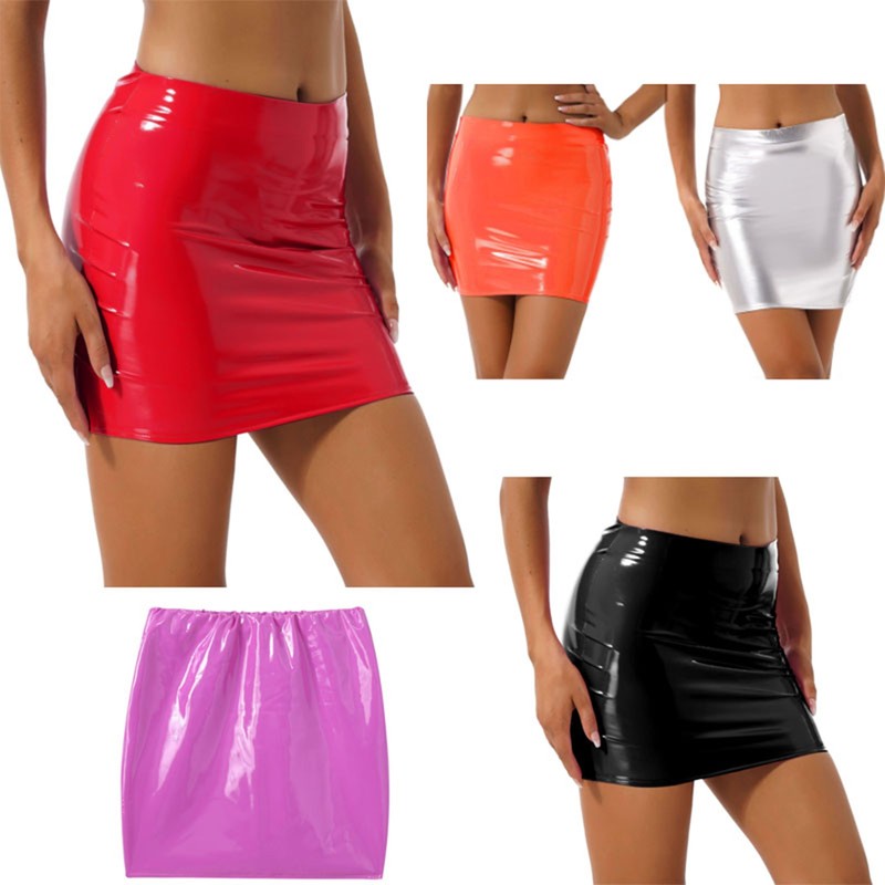 Women Glossy Patent Leather Miniskirt Solid Color Elastic Waistband Pencil Skirt.