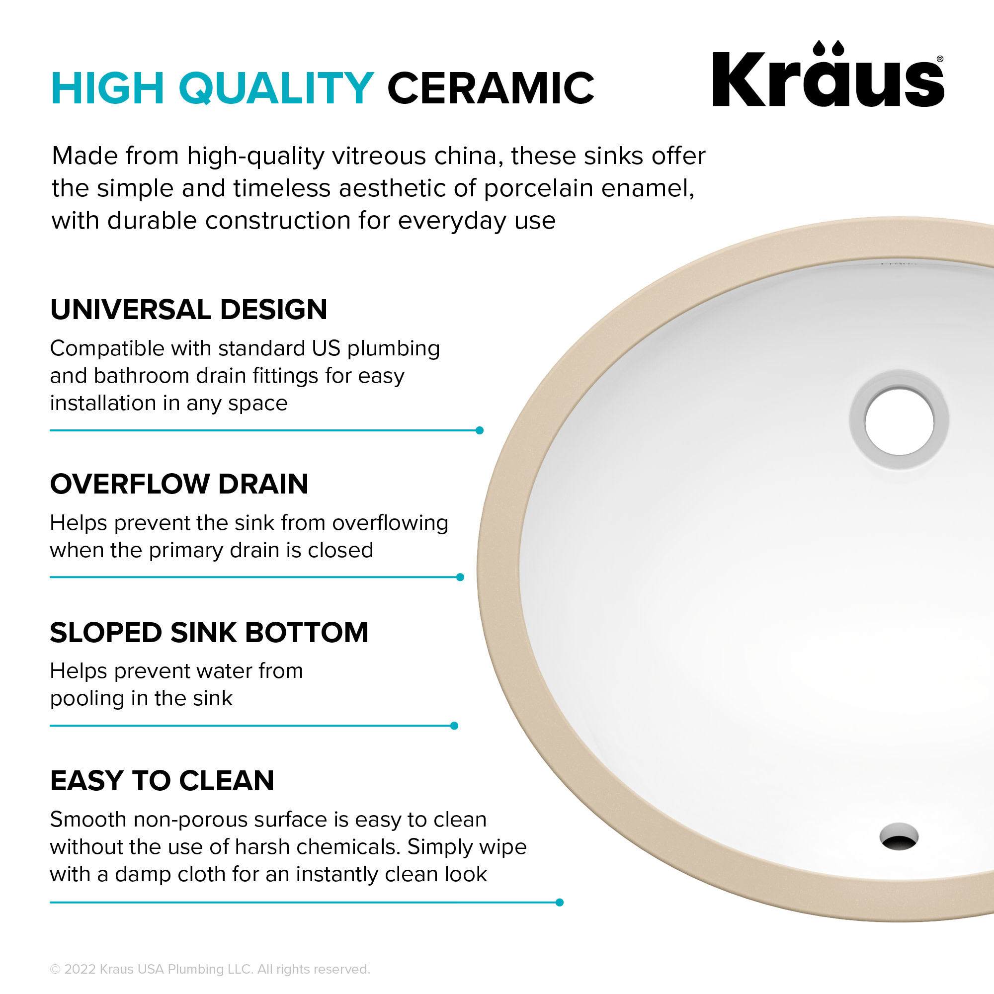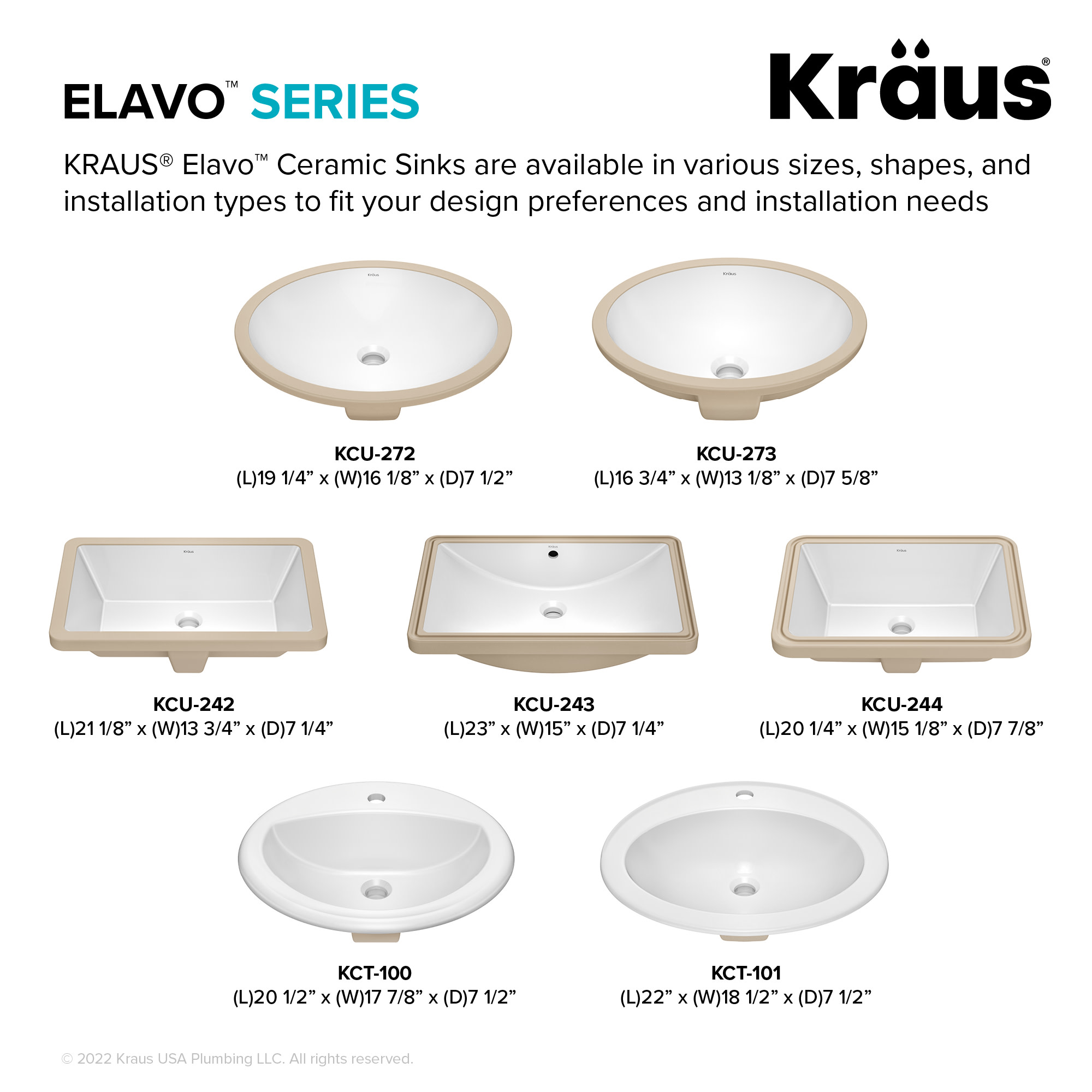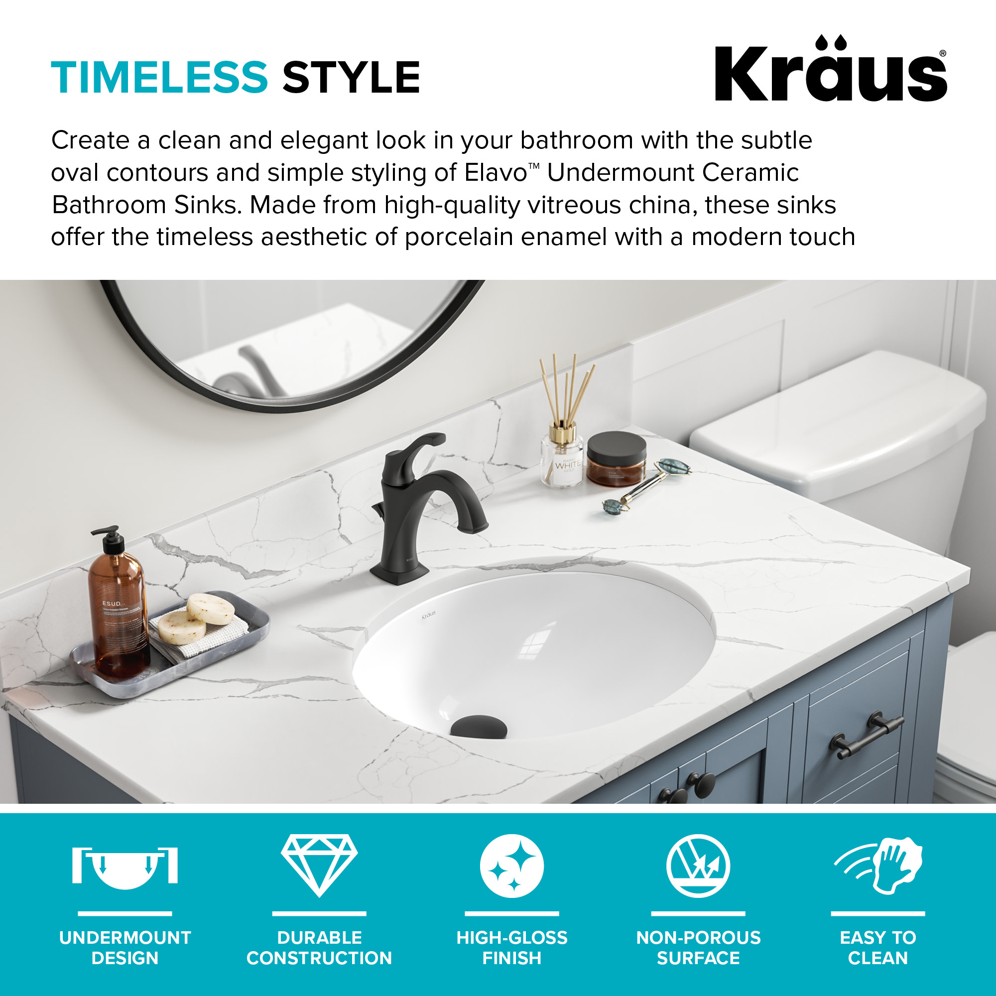Item DescriptionCreate a clean and contemporary look in your bathroom with the streamlined undermount bathroom sink design of Elavo ceramic bathroom sinks from Kraus. Made from high-quality vitreous china, these sinks offer the simple and timeless aesthetic of porcelain enamel, with durable construction for everyday use. The porcelain glaze with a smooth non-porous finish is stain resistant and easily wipes clean. Undermount bathroom sink installation creates a seamless transition between sink and countertop, with no exposed mounting deck, allowing you to easily wipe water into the sink when cleaning your bathroom sink vanity. An overflow drain helps prevent the sink from overflowing while the primary drain is closed. Standard US drain opening is compatible with most plumbing fittings