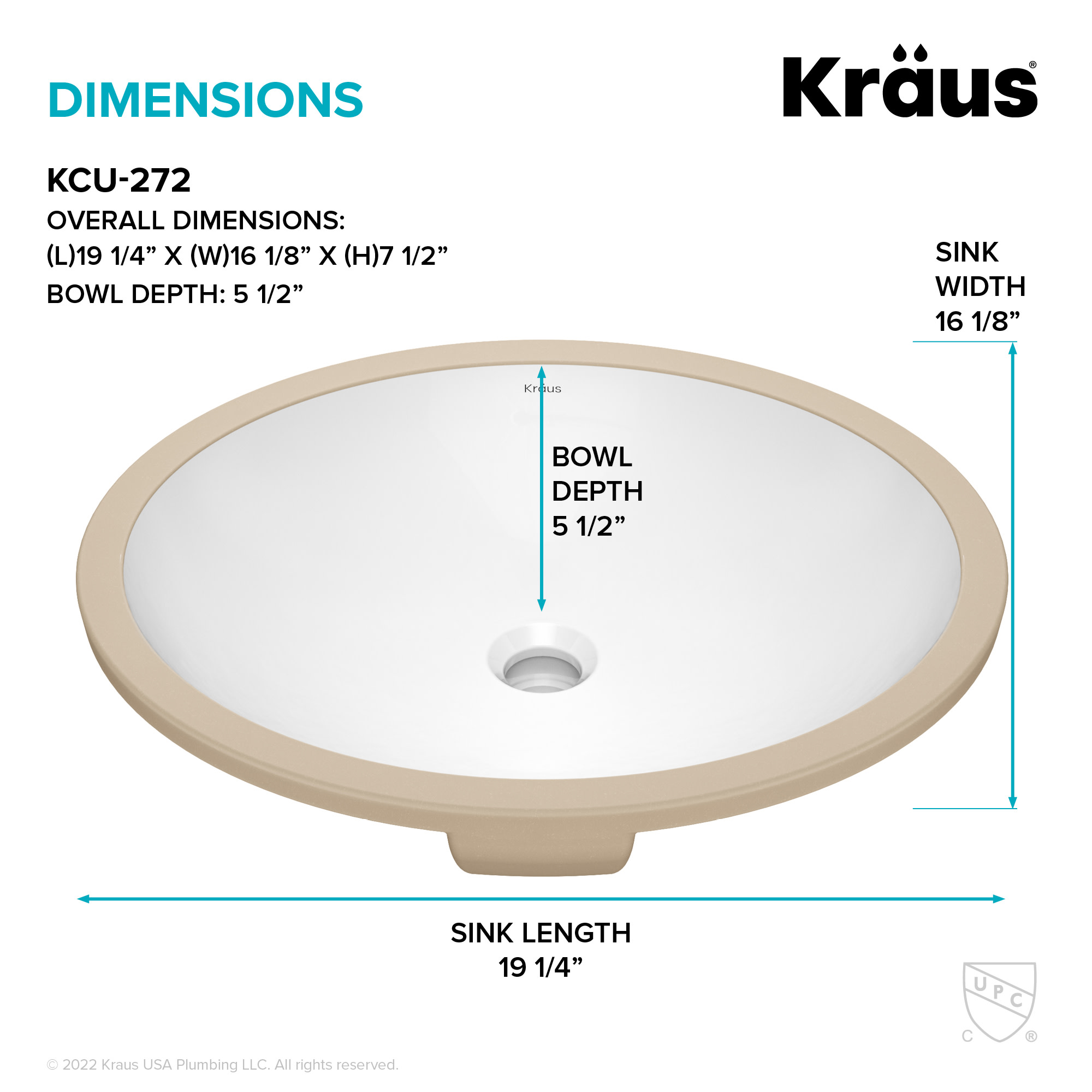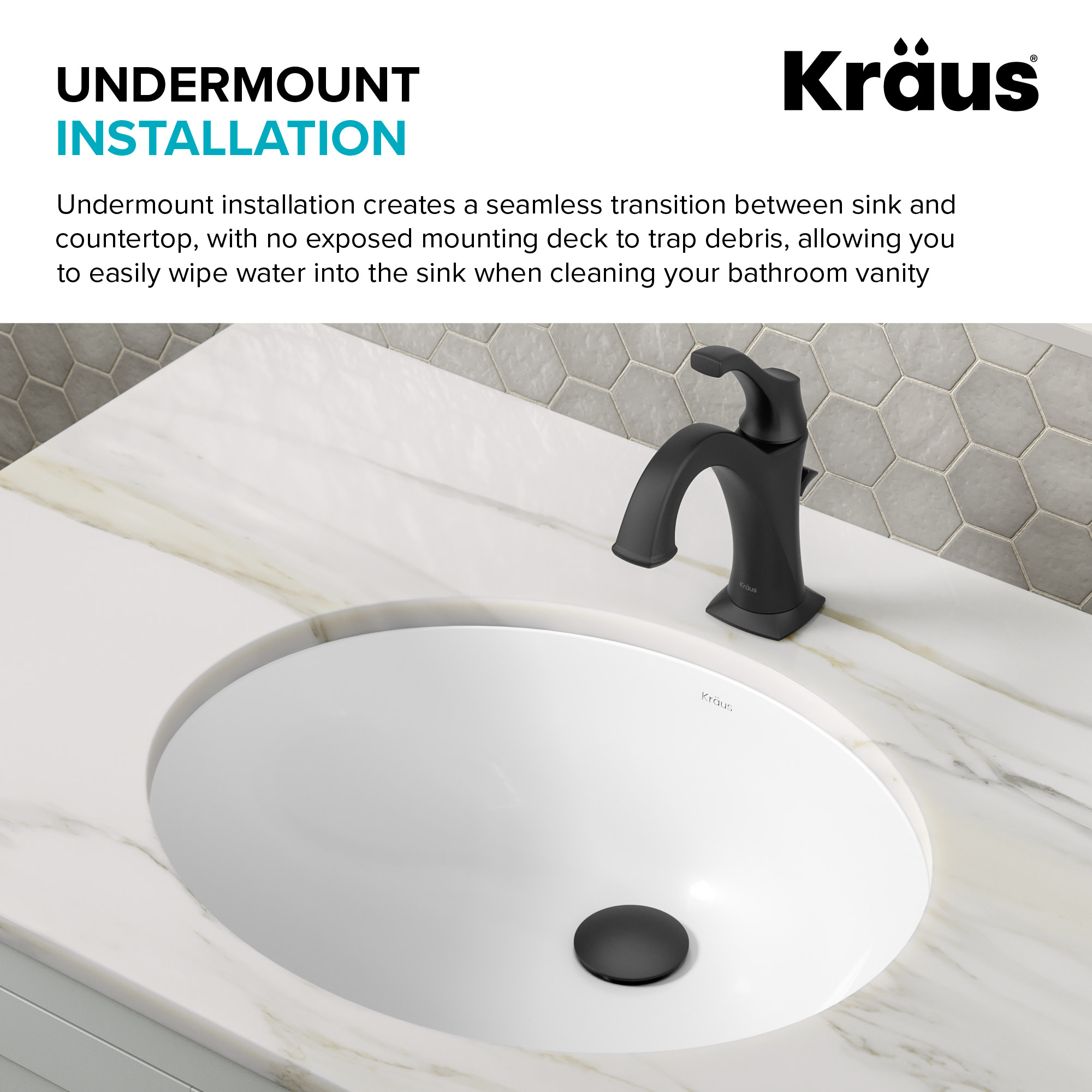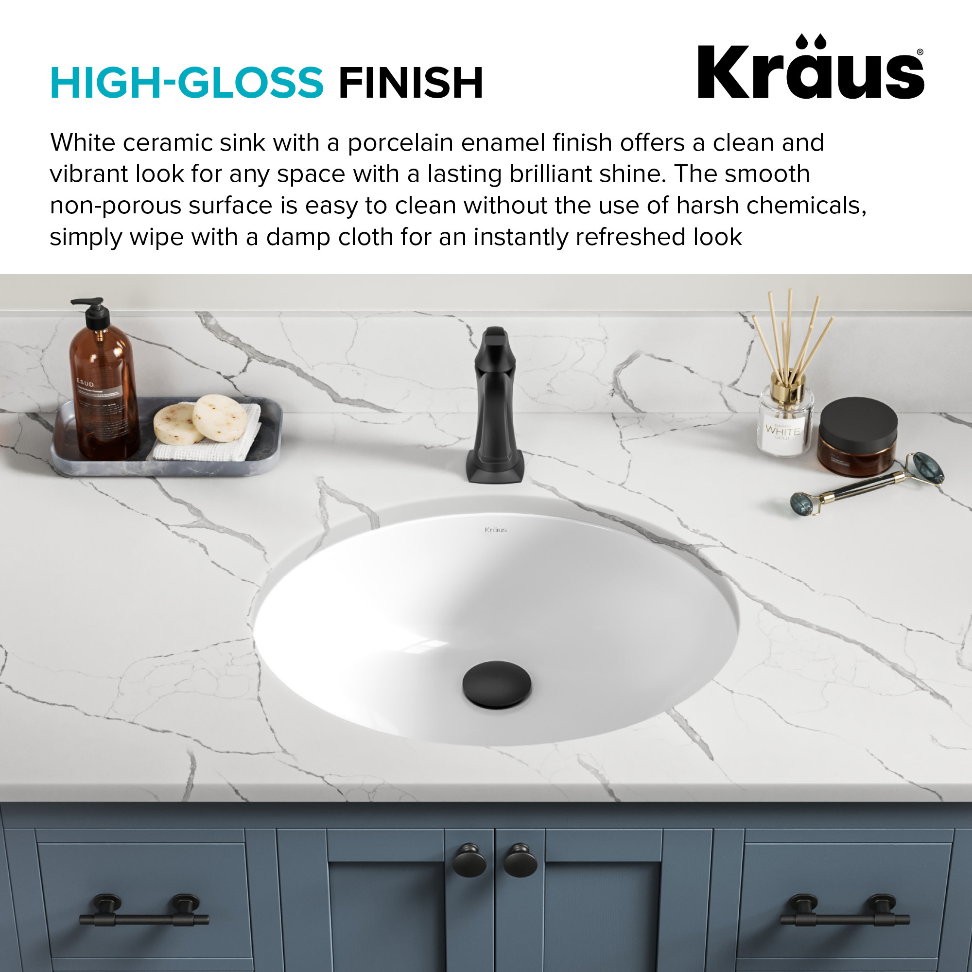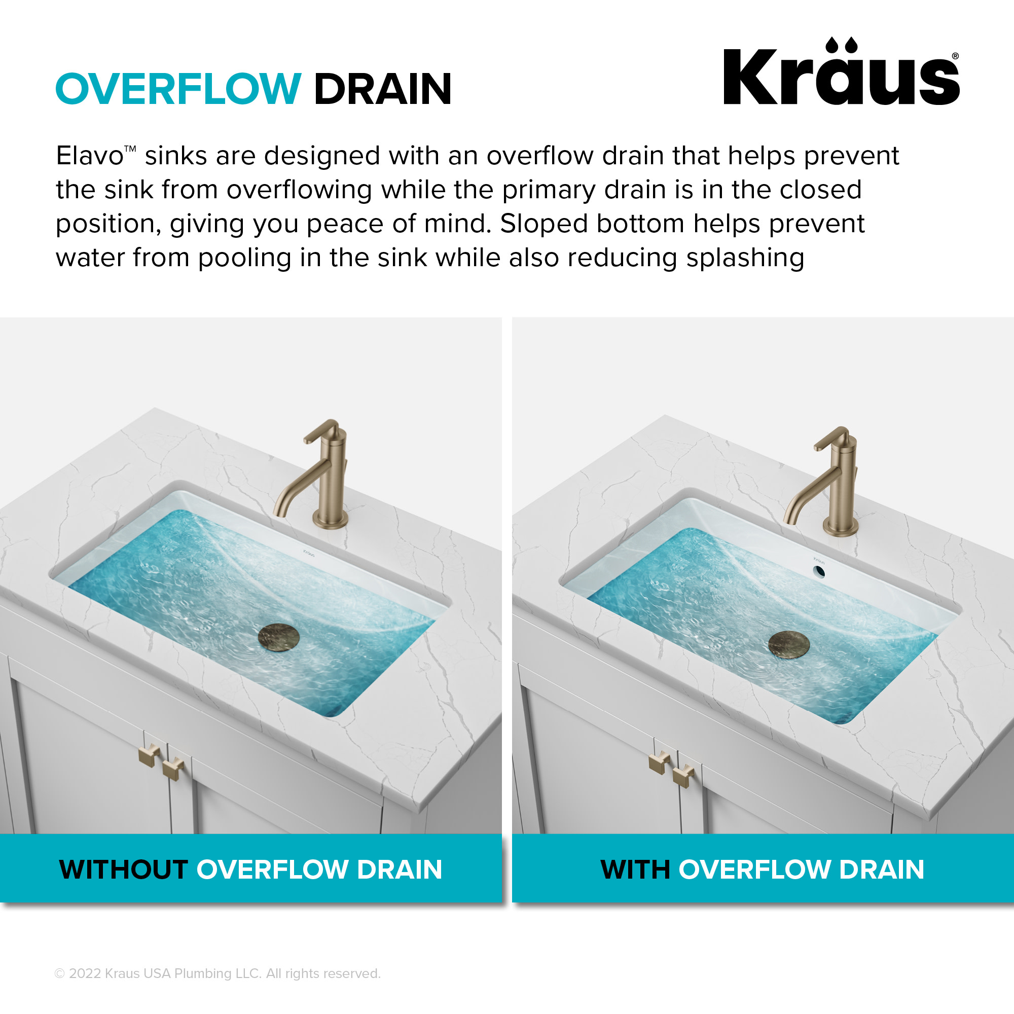 Item DescriptionCreate a clean and contemporary look in your bathroom with the streamlined undermount bathroom sink design of Elavo ceramic bathroom sinks from Kraus. Made from high-quality vitreous china, these sinks offer the simple and timeless aesthetic of porcelain enamel, with durable construction for everyday use. The porcelain glaze with a smooth non-porous finish is stain resistant and easily wipes clean. Undermount bathroom sink installation creates a seamless transition between sink and countertop, with no exposed mounting deck, allowing you to easily wipe water into the sink when cleaning your bathroom sink vanity. An overflow drain helps prevent the sink from overflowing while the primary drain is closed. Standard US drain opening is compatible with most plumbing fittings
