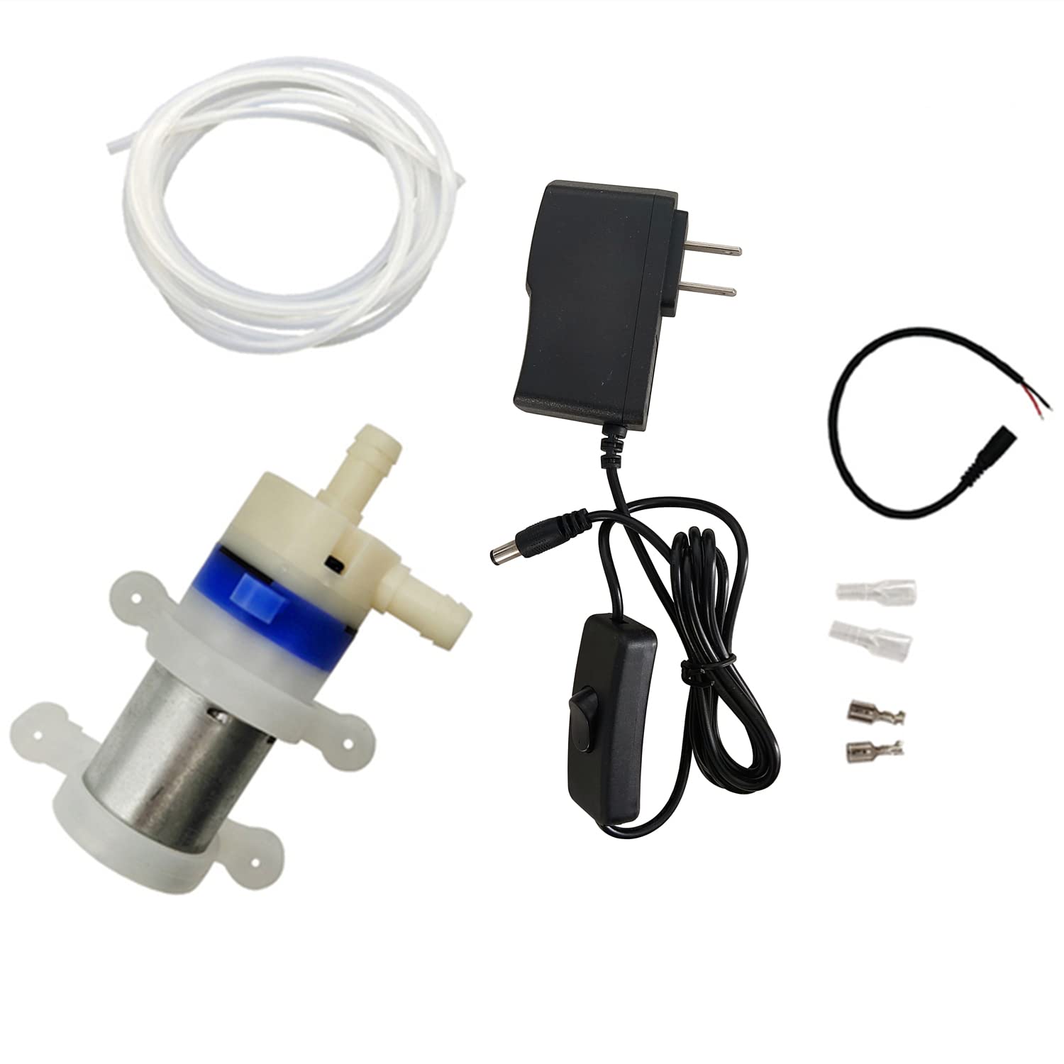 - [Application] Ultra Quiet, easy to install and great pumping performance. Equipped with a fixed base and a 0.6-meter power lead, easy to replace and install. The pump has a self-priming function to prevent liquid backflow. High Quality Long Life Replacement Pump for Hot & Cold Water Dispenser, CPU Cooling, Ultrasonic Cleaner, Ice Maker, Coffee Machine, Refrigerator, Fish Tank, etc.