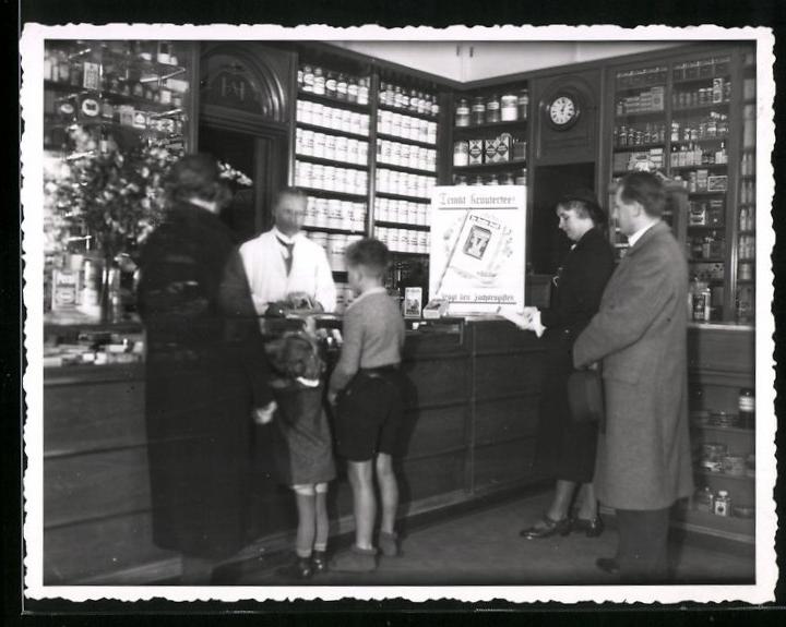 Fotografie Apotheke, Apotheker hinter dem Verkaufstresen im Ladengeschäft