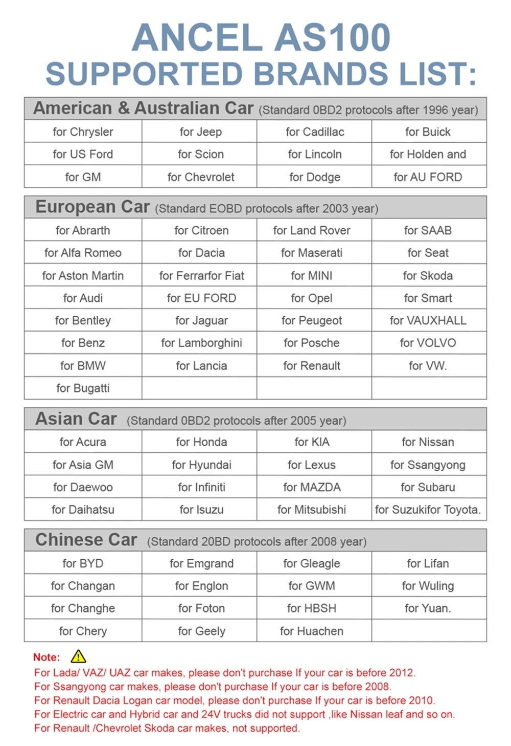 Not Support Russian Cars VAZ,UAZ,LADA ; Not works with trucks