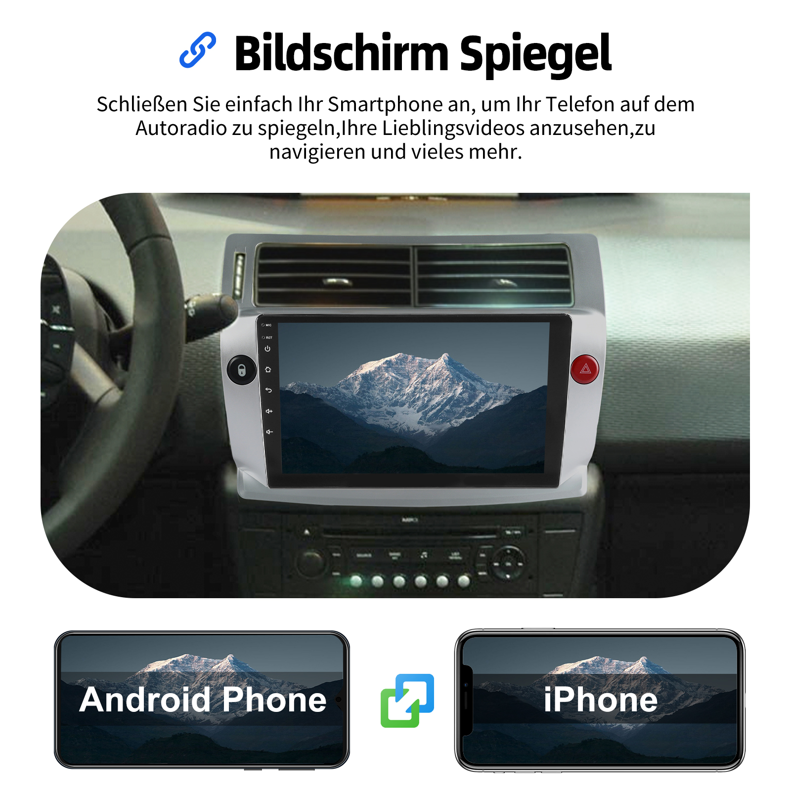 Bildschirm Spiegelfür iOS/Android: Das Autoradio unterstützt Mirror Link für iOS/Android-Telefone. Nachdem Sie das Radio angeschlossen haben, können Sie die Telefonseite mit dem 9-Zoll-Touchscreen des Radios synchronisieren. Das iPhone stellt eine Verbindung über WLAN her, und das Android-Telefon stellt eine Verbindung über WLAN oder das Original-USB-Kabel her (gilt nicht für Samsung- und Huawei-Telefone).