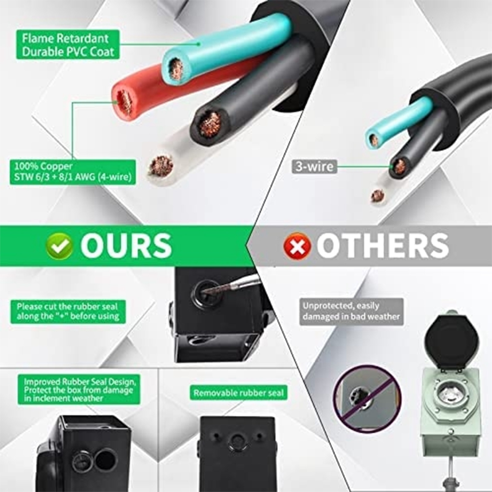 【25FT Power Cord 】-The 25FT length generator cord is suitable for long-distance operation. Possessing the capacity of STW, this 50 amp generator cord can be used indoors and outdoors in all weather and seasons.