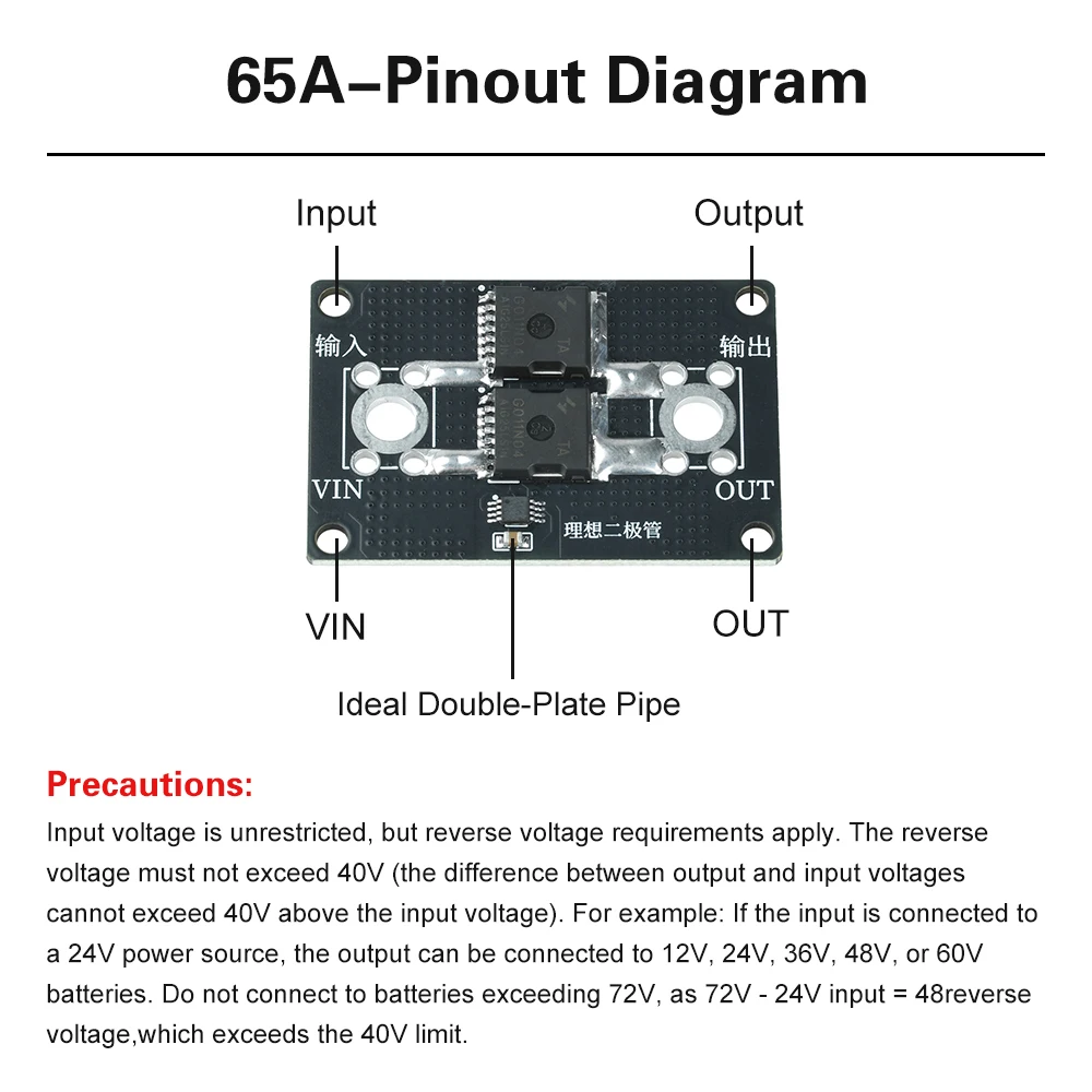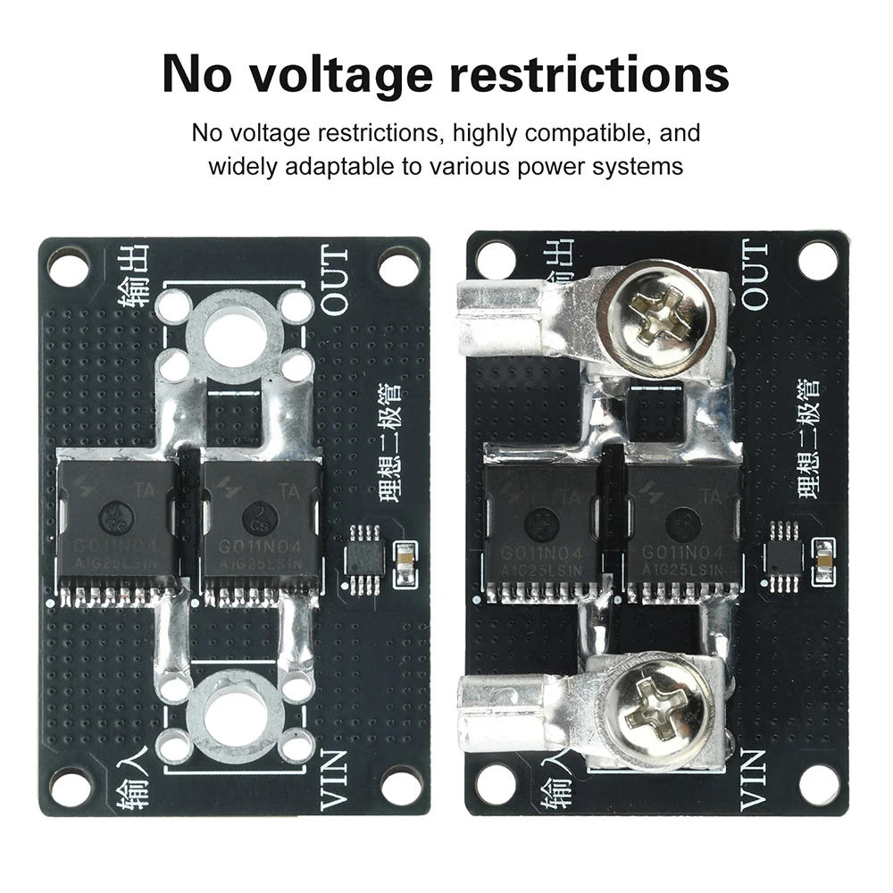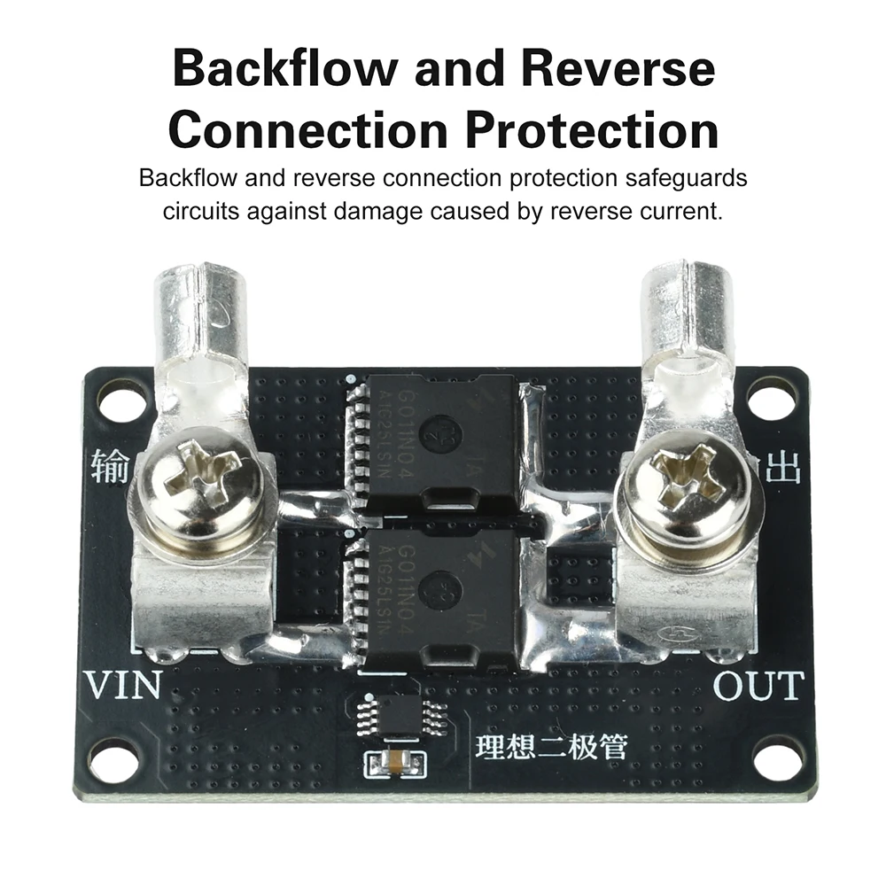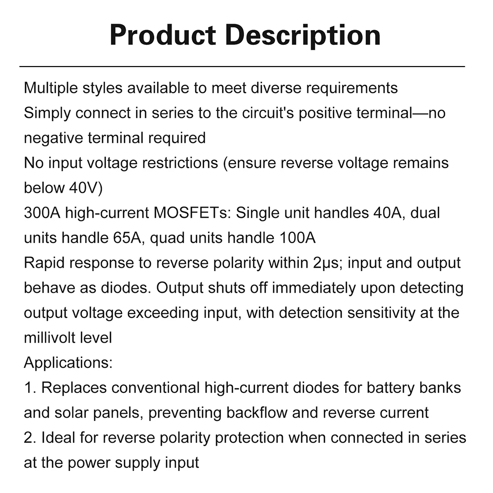 1. Replaces conventional high-current diodes in batteries and solar panels for backflow/reverse current protection