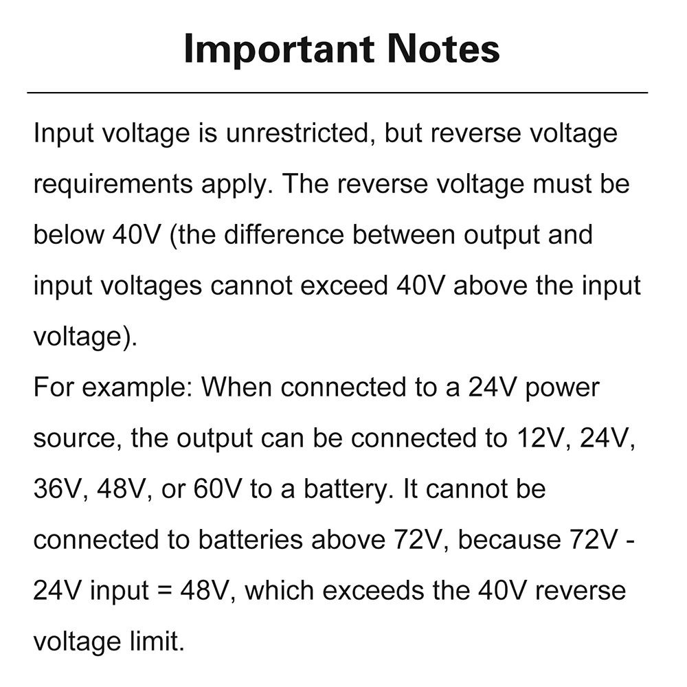- Input connected to 24V power supply: Output can connect to 12V, 24V, 36V, 48V, or 60V to a battery. Do not connect to batteries above 72V, as 72V - 24V input = 48V, exceeding the 40V reverse voltage limit.