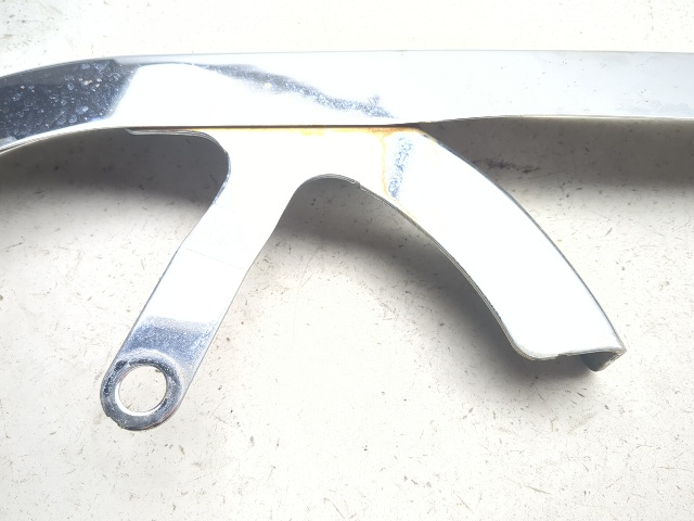 Upper Belt Guard - Chrome protective guard for the final drive belt. Fits 2004-2022 Harley-Davidson Sportster models including XL1200C, XL1200R, XL883, XL883L, XL883N, and others. Note: Features a 'Rockford Fosgate' logo laser-etched on the side. Structurally sound with light age-appropriate surface wear and minor oxidation on mounting tabs. OEM 60402-04, 60367-04.