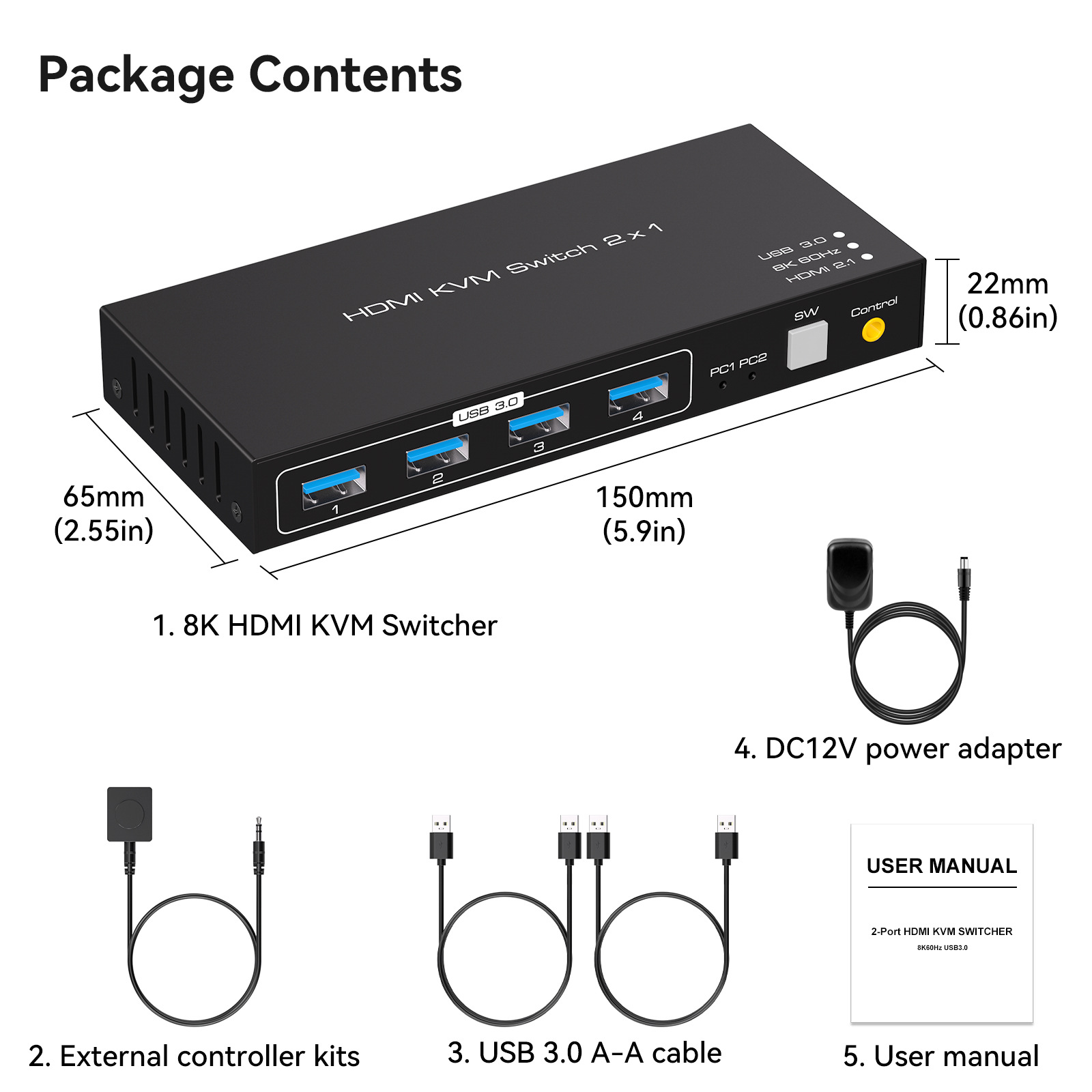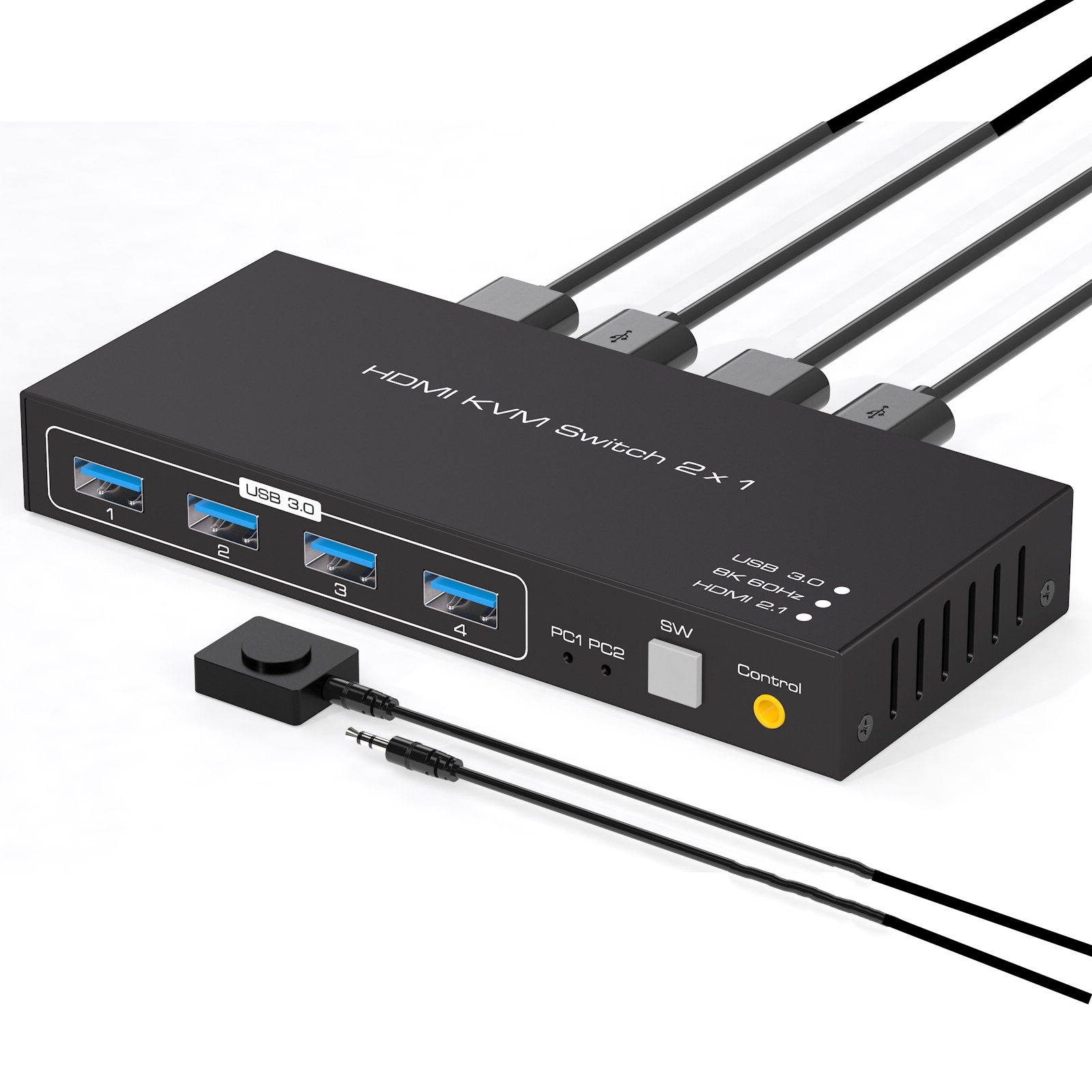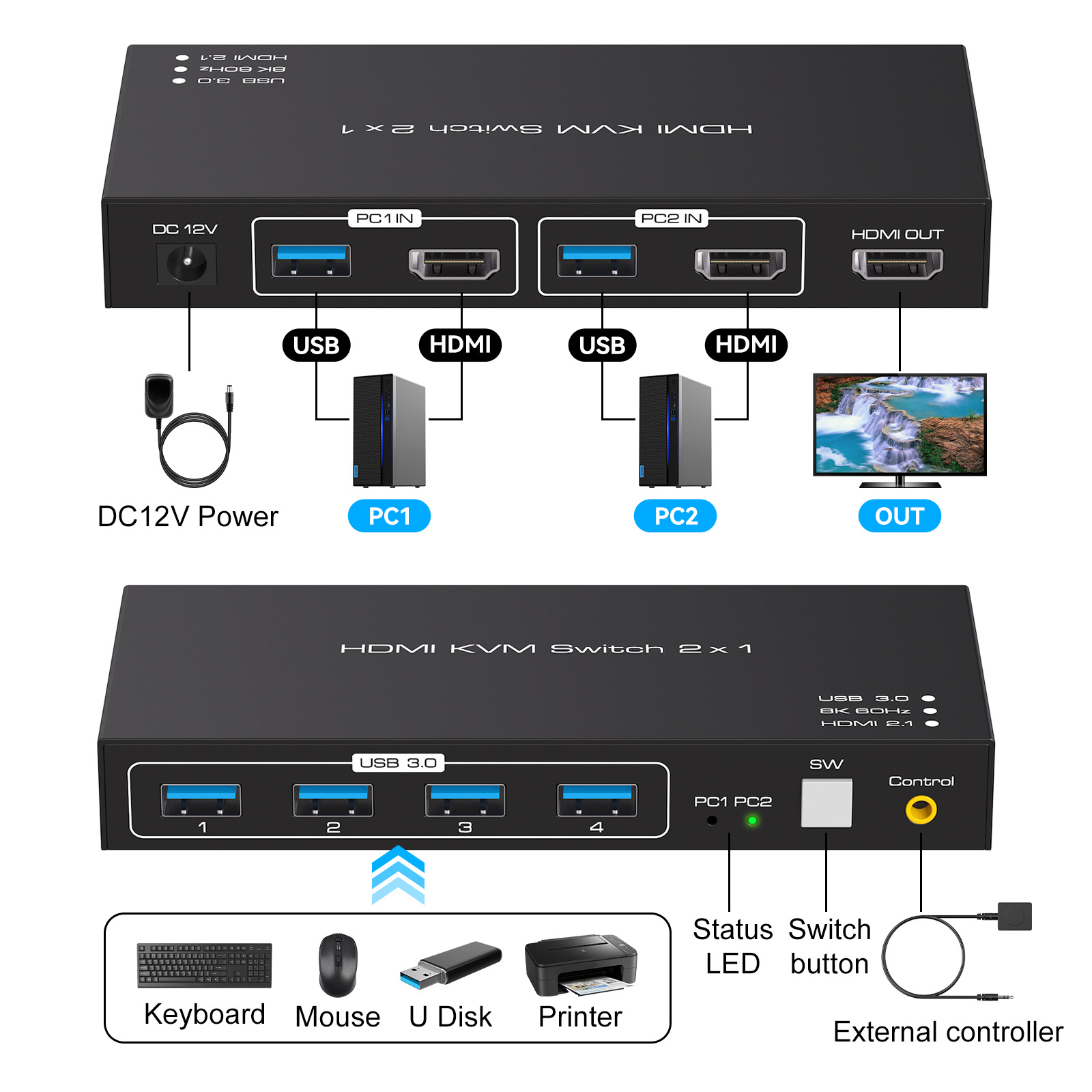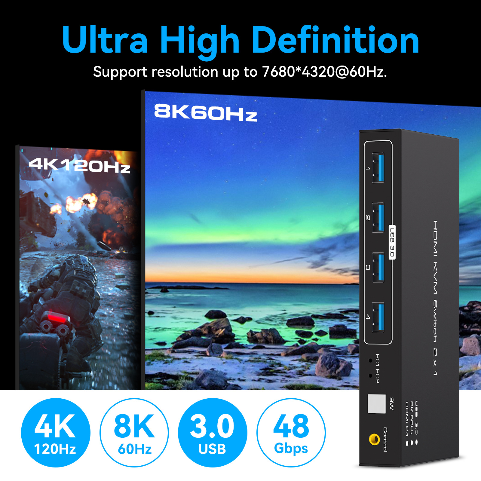2x1 HDMI KVM Switch 4K 120Hz 8K USB3.0 KVM Switcher 2 In 1 Out For 2 Computers 1 Monitors