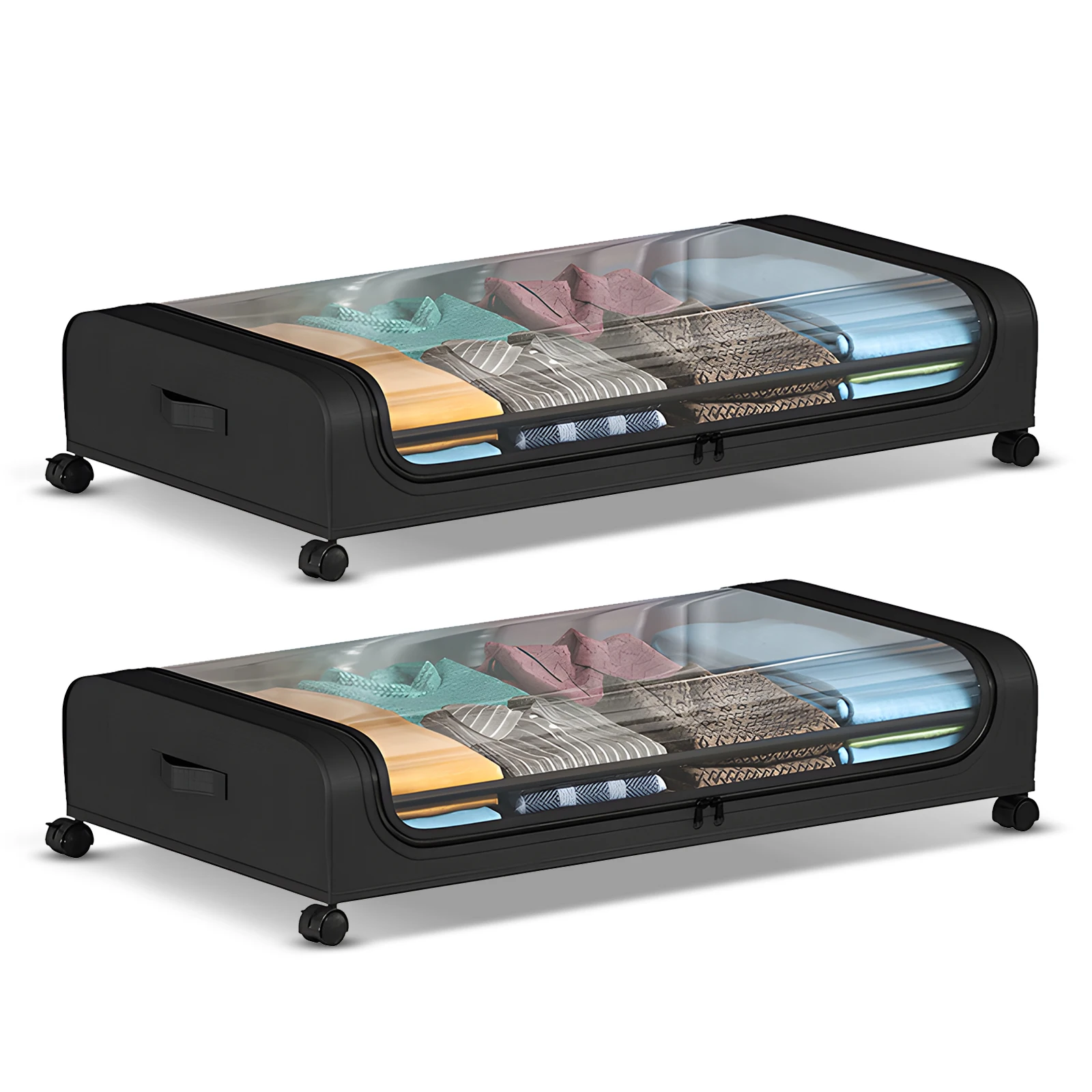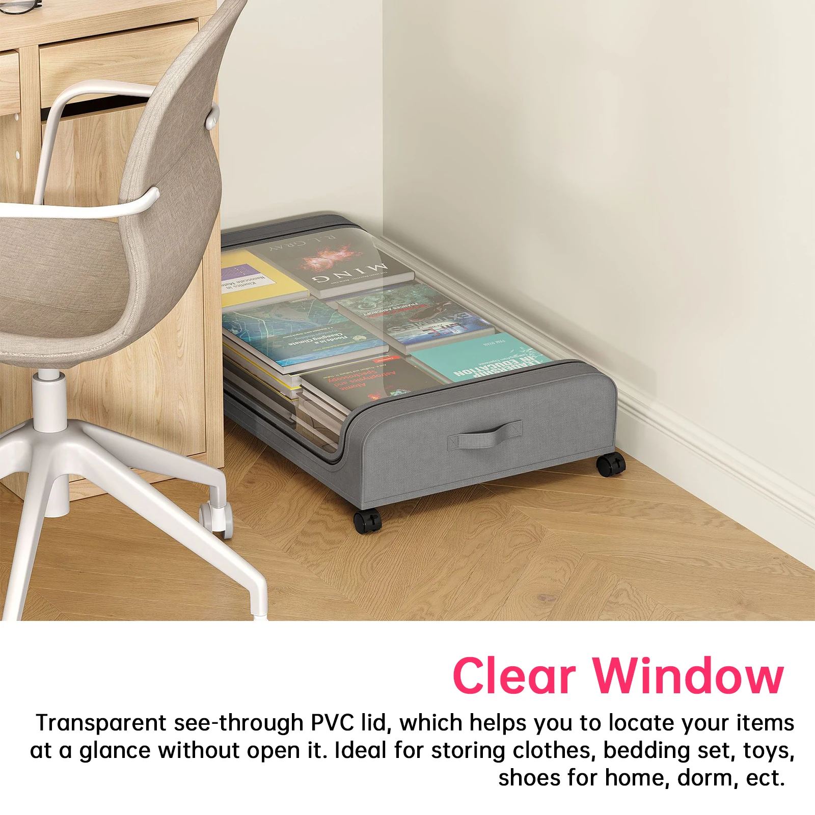 【Clear Window】The under bed drawers with large transparent see-through PVC lid, which helps you to locate your items at a glance without open it, easily access to what you need. Ideal for storing clothes, bedding set, toys, shoes for home, dorm, ect.