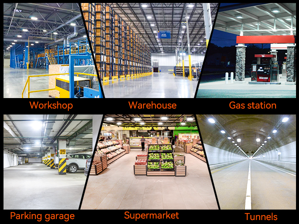 【Wide Application】This led canopy light widely used in construction site lighting, plant lighting, industrial lighting, sports centers, carport, garage, gas stations, workshop, parking lots, waiting rooms, railway stations, ports, terminals and other large-scale energy-efficient lighting indoor and outdoor applications.