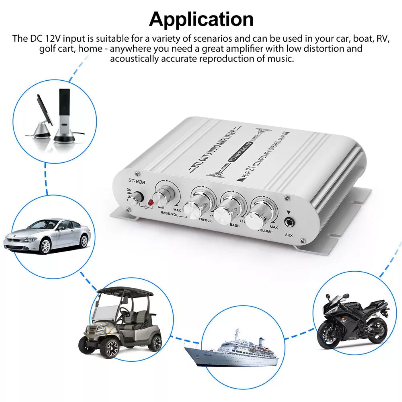 Versatile Applications: Suitable for DC 12V input, it's ideal for various scenarios, including cars, boats, RVs, golf carts, and even homes. Wherever you need a great amplifier with low distortion and acoustically accurate music reproduction, this is the perfect choice.