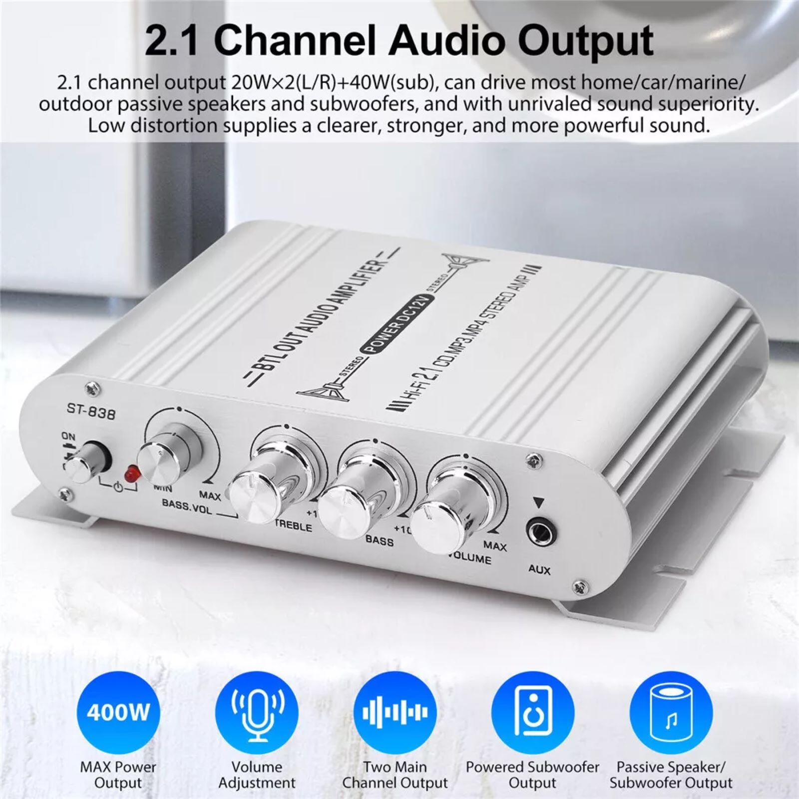 Channel Configuration: 2.1 Power Amplifier, supports connection to 2 speakers and a subwoofer