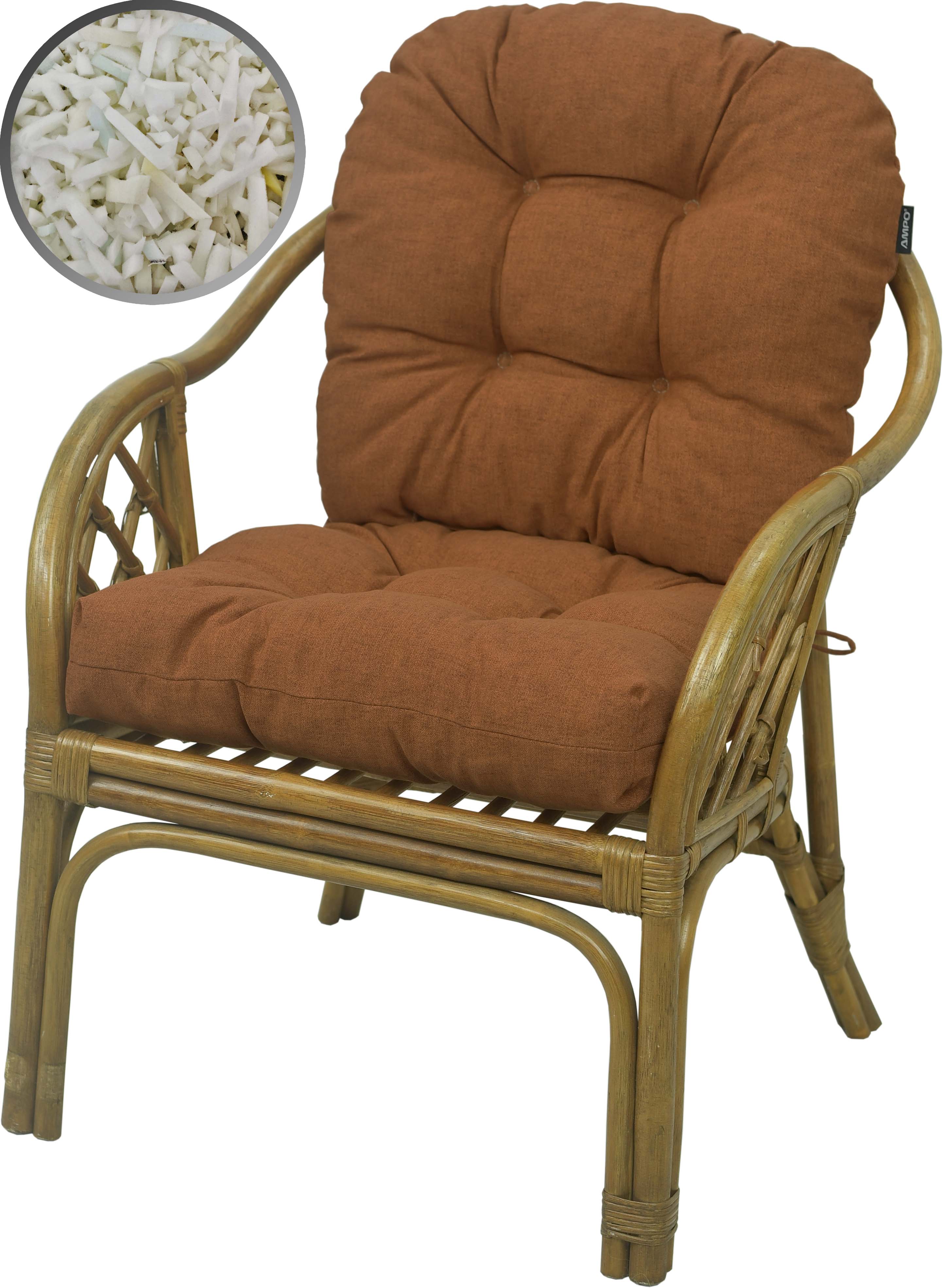 I cuscini per le poltrone in rattan sono completamente cuciti in tessuto, senza l'uso di materiali di ricambio.