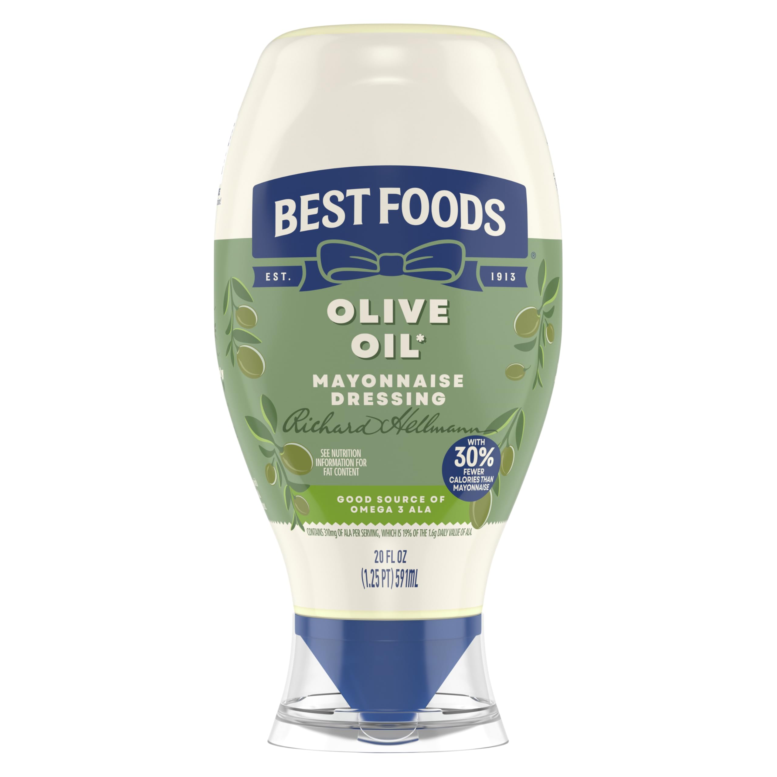 Best Foods Mayonnaise with Olive Oil combines the creamy, rich taste you love from Best Foods with the delicious goodness of olive oil. It's simple. Only the finest quality ingredients – like cage free eggs, responsibly sourced oils and vinegar – make it inside Best Foods Mayonnaise Sandwich Spread. We know that to really "Bring Out The Best," we need to do more than just taste great. Even after 100 years, we’re still committed to using premium ingredients to craft the highest quality mayonnaise, dressings and condiments. In fact, we use 100% cage-free eggs and are committed to 100% responsibly sourced soybean oil. No wonder we deliver the rich and creamy taste America loves. Best Foods Mayonnaise with Olive Oil is an excellent source of Omega 3 ALA (contains 360mg ALA per serving, which is 22% of the 1.6g daily value for ALA), with 0g of trans fat per serving, and is also gluten-free and certified kosher. Our unique squeeze bottle, with clean lock cap and precision tip, lets you squeeze with ease, and gives you the control to get your Best Foods exactly where you want it to create delicious, simple meals. It’s the ideal condiment for spreading on sandwiches and wraps, grilling juicy burgers, baking flavorful fish, mixing creamy dips, and preparing fresh salads. Best Foods is known as Hellmann's East of the Rockies.