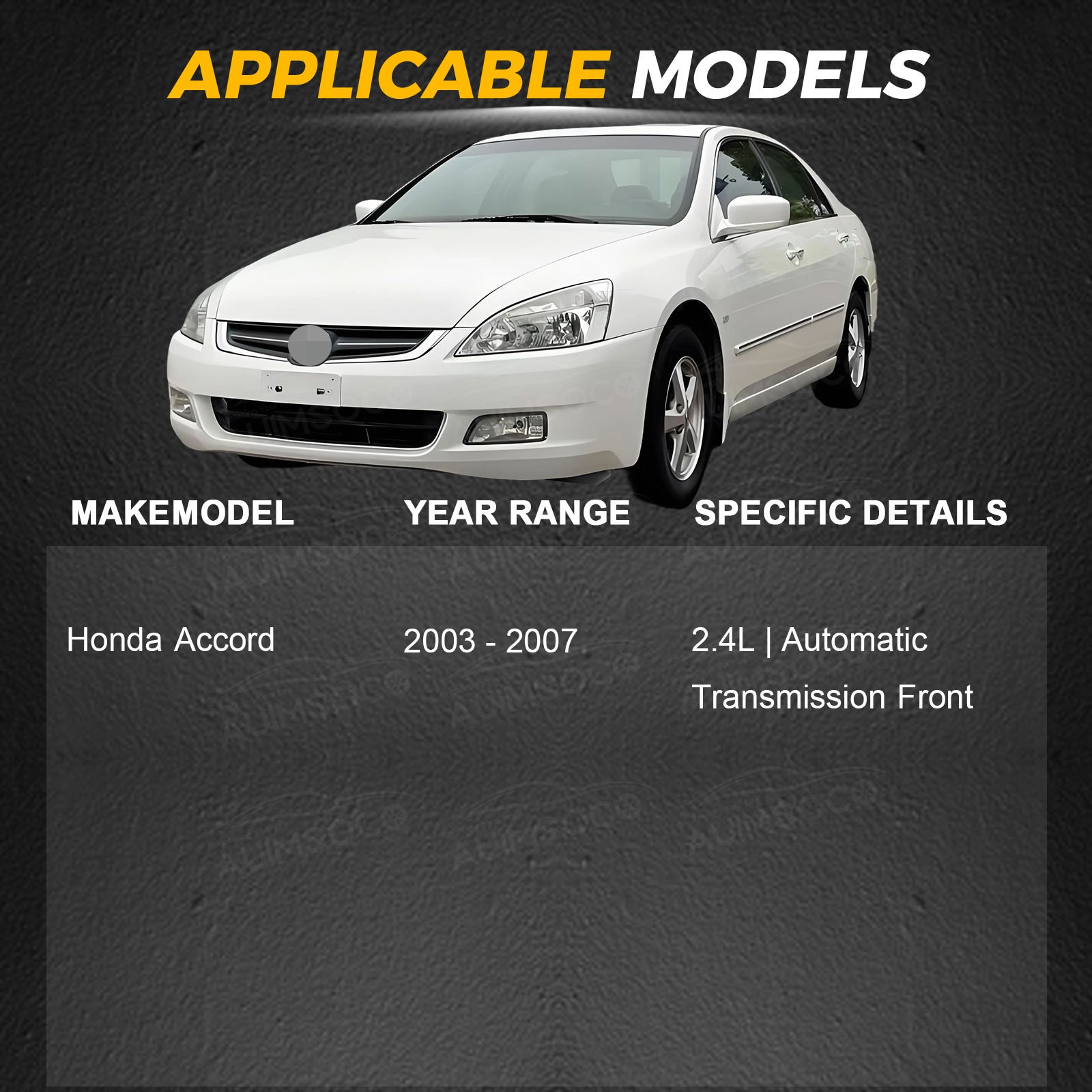 | 2003-2007 | Honda | Accord | Front | L4 2.4L;w/MT |