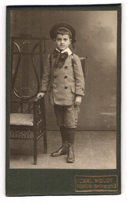 Fotografie Carl Moldt, Pankow, junger Knabe im Anzug mit Schulranzen zum Schulanfang