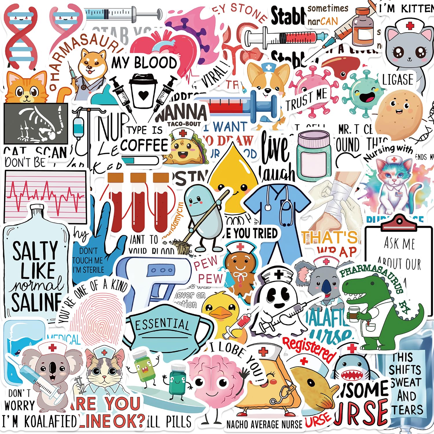Nurse Stickers: With 50 different patterns, this sticker not only has tons of everyday nurse medical content, but it also incorporates lots of cuteness. This sticker not only manages to be medically relevant in its content, but humorous and fun at the same time!