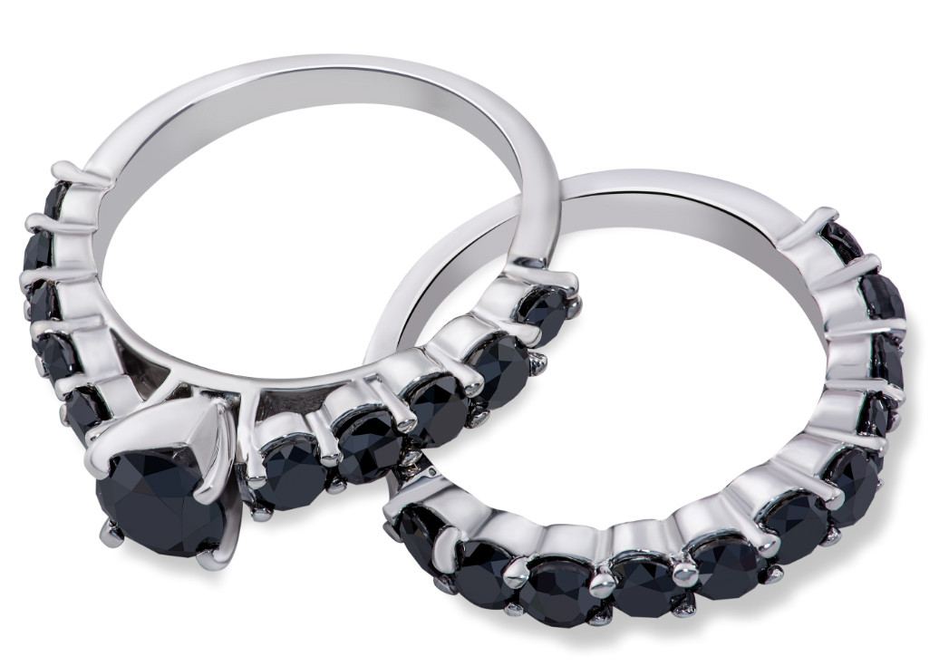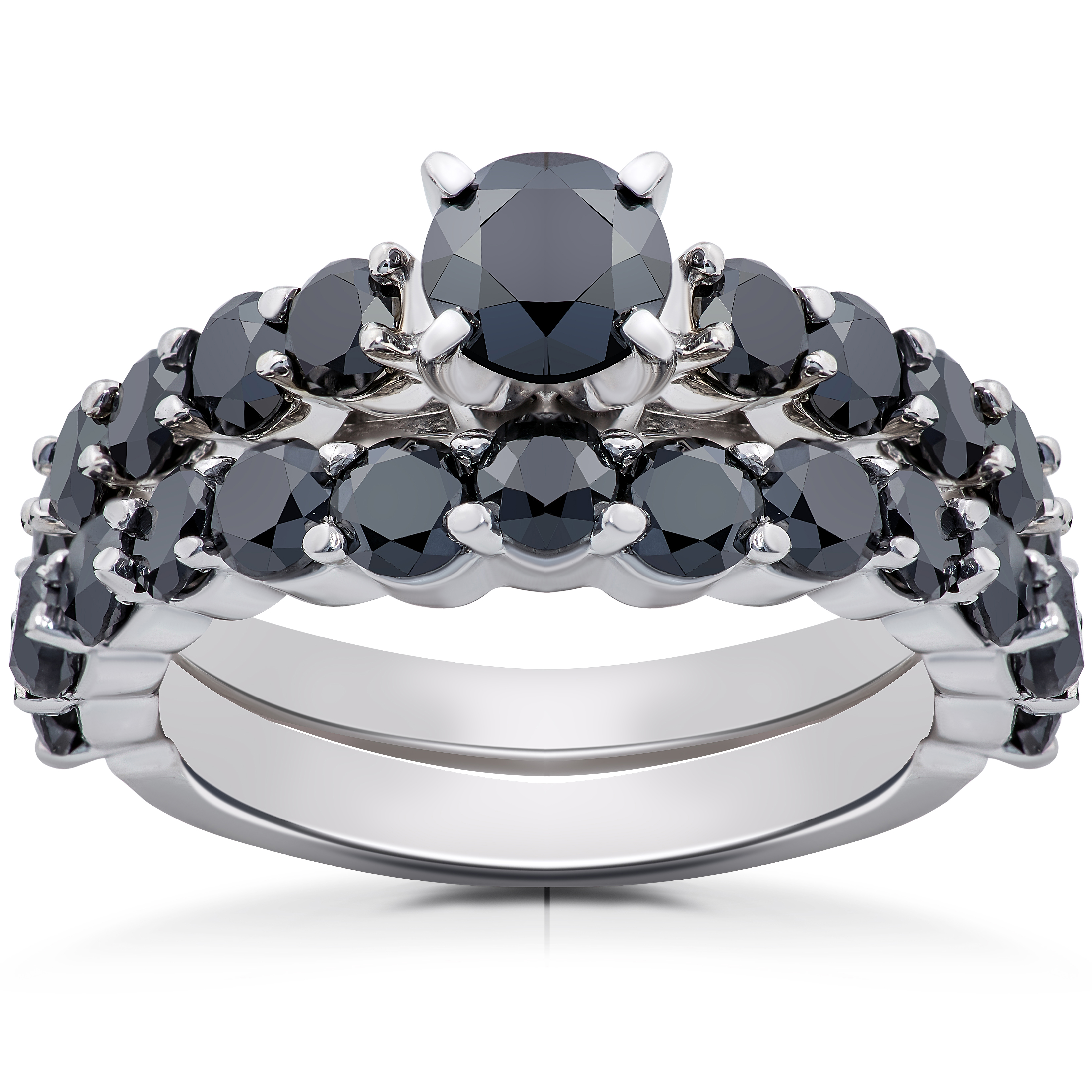 Womens engagement ring set features a 1/2ct round brilliant cut genuine black diamond and 21 round black accent diamonds. All diamonds are set in solid 14k white gold. Matching wedding ring included.