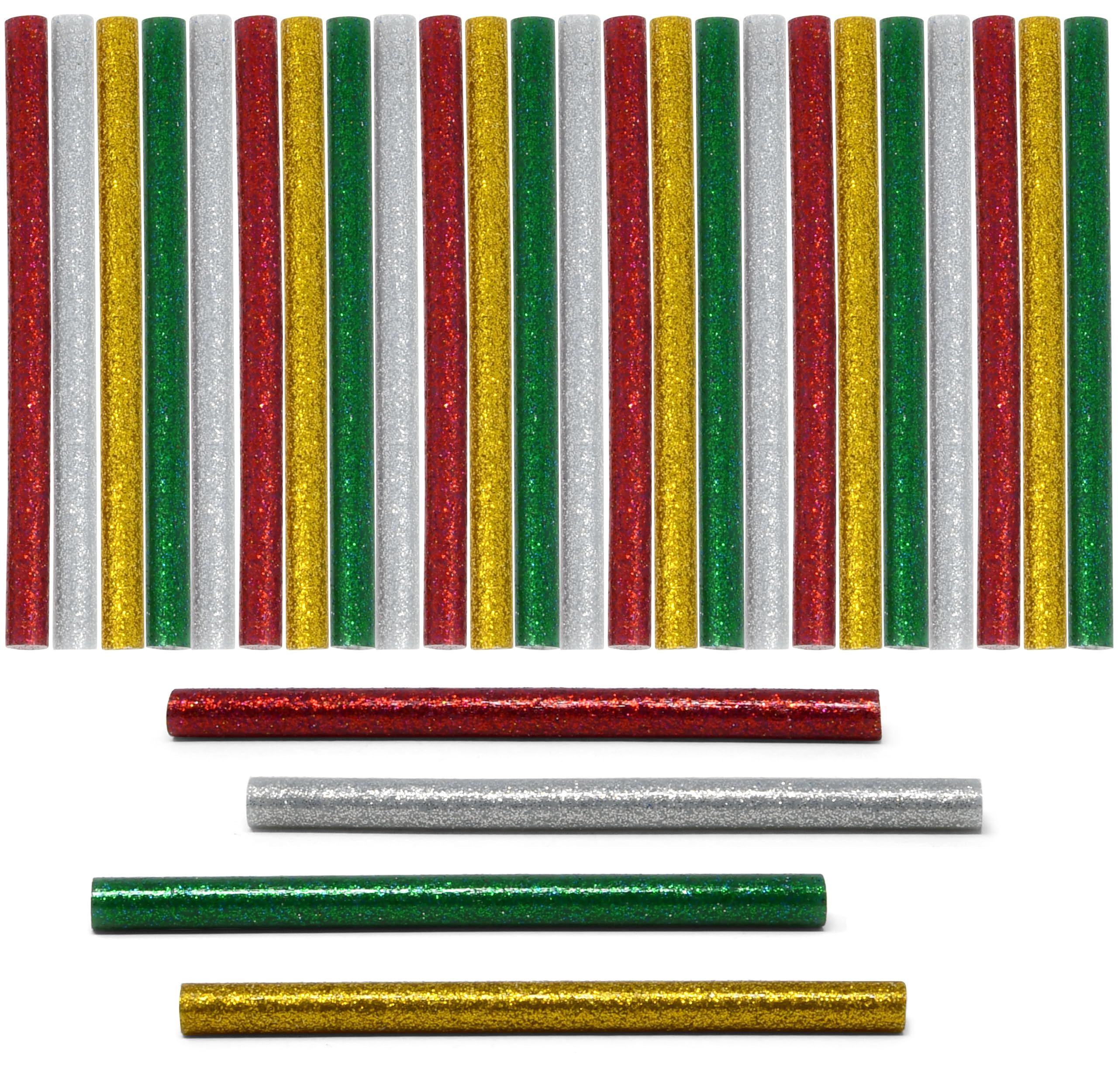 Festive Color Selection: Includes four vibrant colors metallic gold, silver, red, and green perfect for adding a holiday touch to all your craft projects total of 100 mini glue sticks. High-Quality Adhesive: Designed for a strong and durable bond, these glue sticks work seamlessly with most standard hot glue guns. Convenient Size: Each stick measures 0.27" in diameter and 4" in length, fitting perfectly in most hot glue guns for easy handling. Versatile Crafting Use: Ideal for holiday decorations, DIY projects, gift wrapping, and other festive arts and crafts, making your creations stand out. Quick Melt Technology: These glue sticks melt quickly, allowing for efficient crafting without long wait times, so you can focus on your creativity. Perfect for All Skill Levels: Whether you're a crafting novice or a seasoned pro, these colorful glue sticks are easy to use and will elevate your holiday projects.