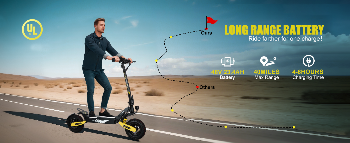 Extended Range: 48V 23.4AH lithium battery delivers 40 miles per charge (64km) - no daily charging!