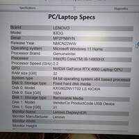 Lenovo Legion 5 16IRX9 16" i9-14900hx 2.2GHz 32GB RAM 1TB SSD GeForce RTX 4060 Items included in this sale: Lenovo Legion 5 16IRX9 16" i9-14900hx 2.2GHz 32GB RAM 1TB SSD GeForce RTX 4060Genuine ChargerSorry, no box or anything else included *Please note, if it is not listed it is not included - such as power cables or other accessories. Specifications: Collection Windows Laptops Sub-Collection Lenovo Laptop Brand Lenovo Model Legion 5 MPN 16IRX9 Release Year 2024 Operating System Windows 11 Home Processor Brand Intel Processor i9-14900hx Processor Speed 2.2GHz GPU/Graphics Card GeForce RTX 4060 Memory (Ram) 32GB RAM Storage 1 1TB Storage Type 1 SSD Storage 2 N/A Storage Type 2 N/A Screen Size 16" Resolution 2560 x 1600 Integrated Graphics Intel UHD Graphics 770 Display WQXGA IPS LCD Refresh Rate 240Hz Bluetooth Yes Webcam Yes Microphone Yes Touch Screen No Backlit Keyboard Yes WiFi Yes Color Arctic Gray Absolute/Computrace Enabled? No MFG Warranty? No Condition Good Connections Charging Port 3.5mm Headphone/Microphone Combo SD Card Reader HDMI Port UPC 197530812118 Serial# MP2PNMYN Cosmetic condition: The bezel is in good cosmetic condition with little to no wear. The hinges are in good condition, sturdy and functioning properly. The keyboard is in good condition with some minor wear and signs of use. The screen is in good condition with some minor wear and scuffs. All four sides are in good cosmetic condition with minimal wear. All of the ports are in good condition and clean. The bottom is in good cosmetic condition with minimal wear. The top is in good cosmetic condition with minimal wear. Please view our close up photos, as these are taken of the actual item being offered for sale. Functionality condition: The keyboard has been tested and all keys function properly. This device successfully connects to WiFi networks and the audio was tested by playing a video. The WiFi and audio are both fully functional. The display is fully functional with no damage or issues.