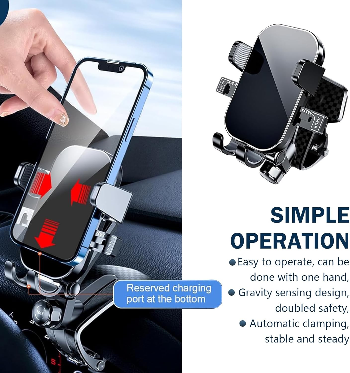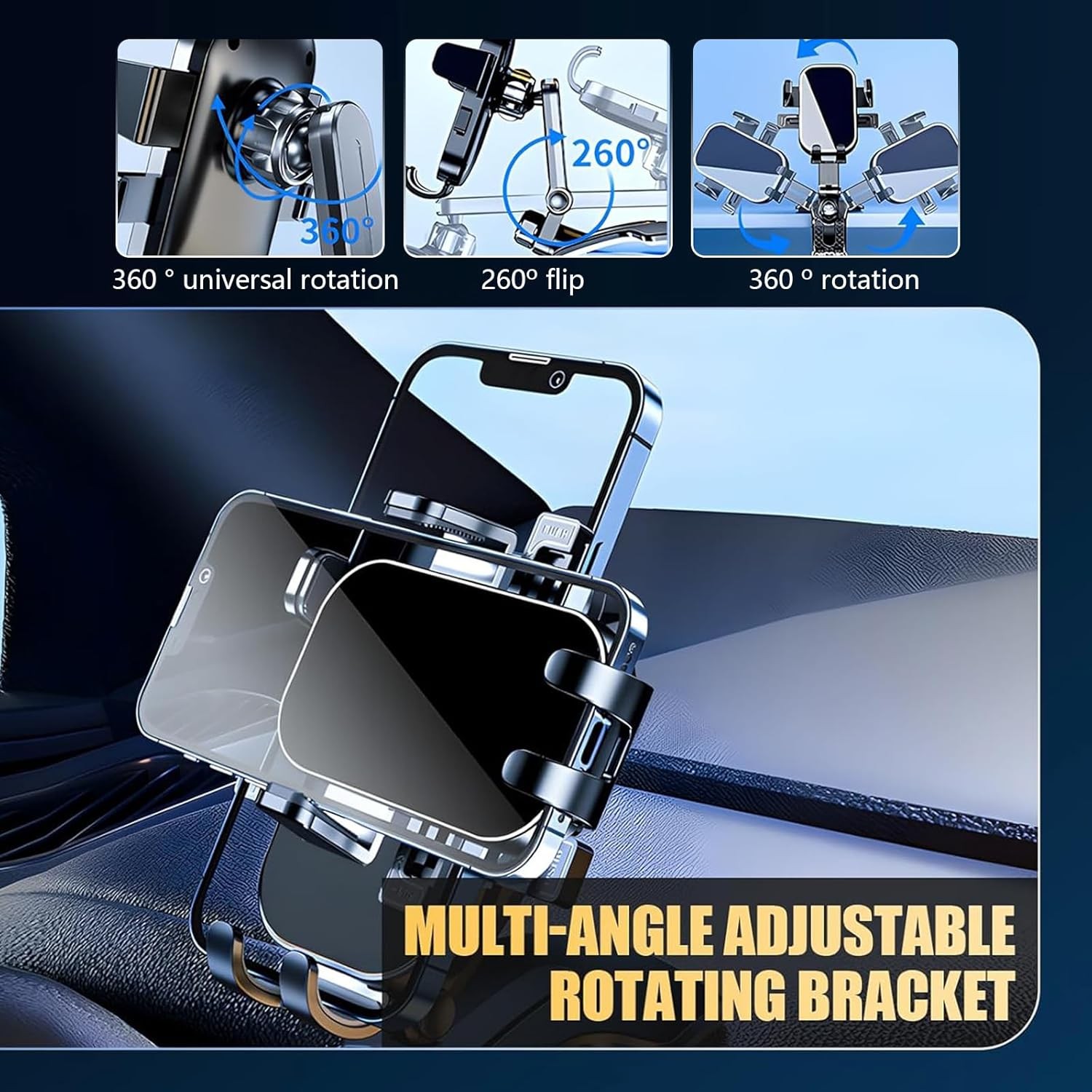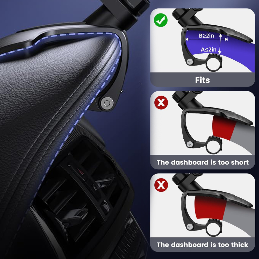 Dashboard Clip Mount: The dashboard phone holder is mounted in line with the road, no need to look down to the car screen, it could ensure you have a boundless view while using GPS or talking, safe driving in the eye line.