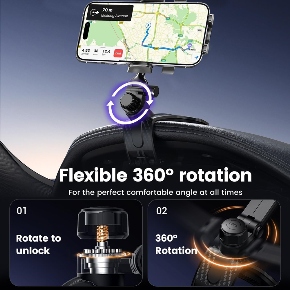 Rearview Mirror Installation: Easy to insert your smartphone in the bracket with just one hand, the mount rotates fully in all directions, including 360-degree vertical and horizontal rotation and 180-degree tilt. Perfect for navigation, allowing eyes to stay on the road without looking down for directions.