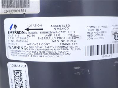 EMERSON K55HXMWP-0732 Blower Motor 1HP 115V 1075RPM 4SPD 11.0A 1PH