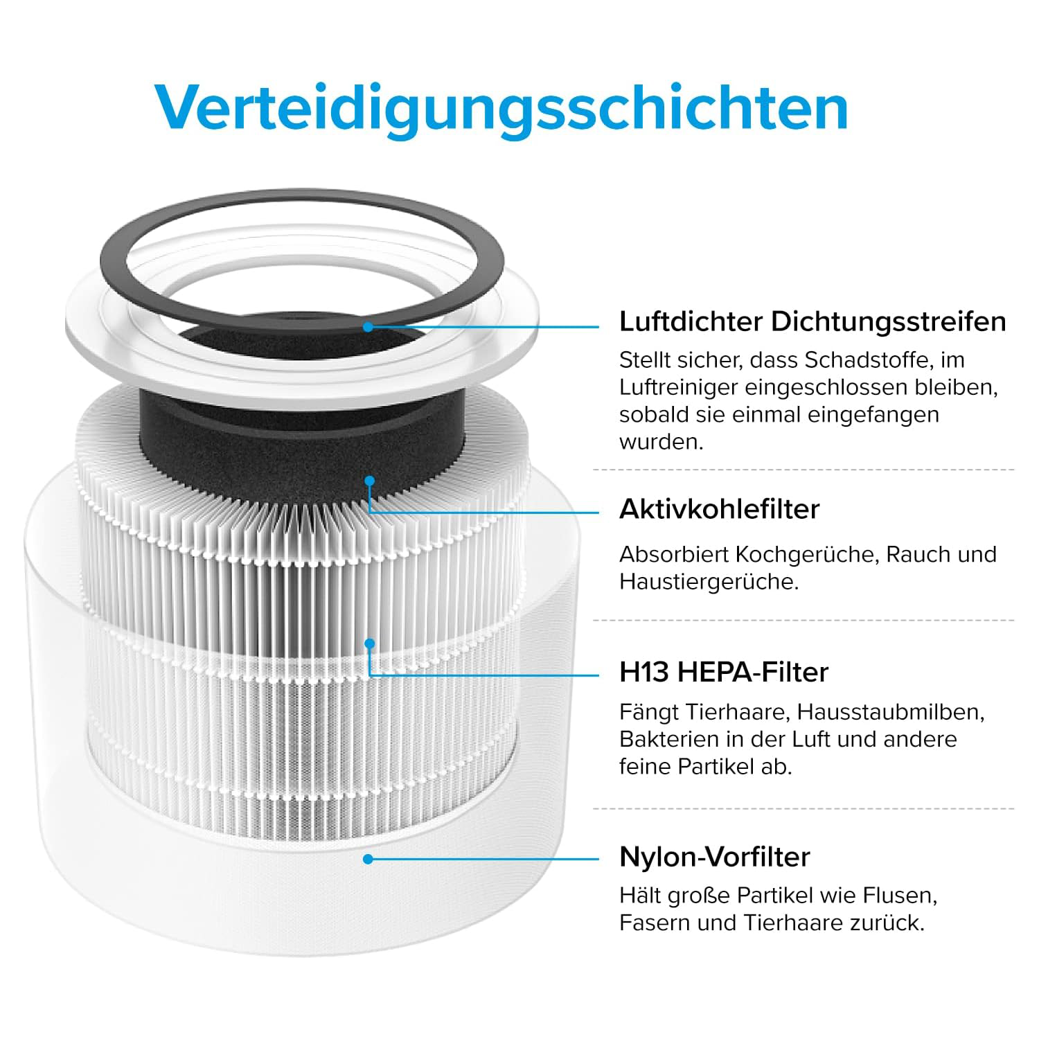 【3-STUFIGE HOCHEFFIZIENTE FILTRATION】 – Unser Core 300RF-Ersatzfilter ist speziell für das 3-in-1-Stufen-True-HEPA-Filtrationssystem konzipiert: ①Feiner Vorfilter ②True HEPA-Filter der Güteklasse H13 ③Aktivkohlefilter