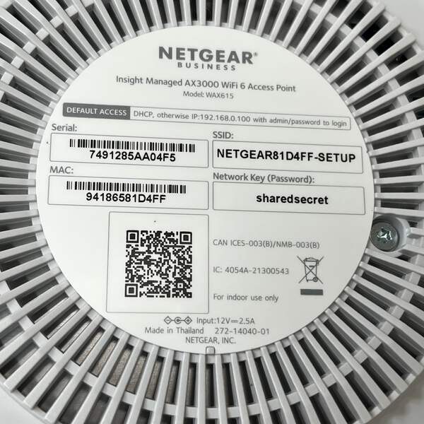 NETGEAR Dual Band PoE Multi-Gig Insight Managed WiFi 6Access Point Condition: New Size: 6 Access Point / 2,750 sq ft / 3Gps Up to 256 Devices Color: White Model: WAX615-100CNS Description: Get powerful and reliable WiFi 6 connectivity for all your devices, even in high-density environments. Simplified enterprise-grade security and networking for the smaller business.