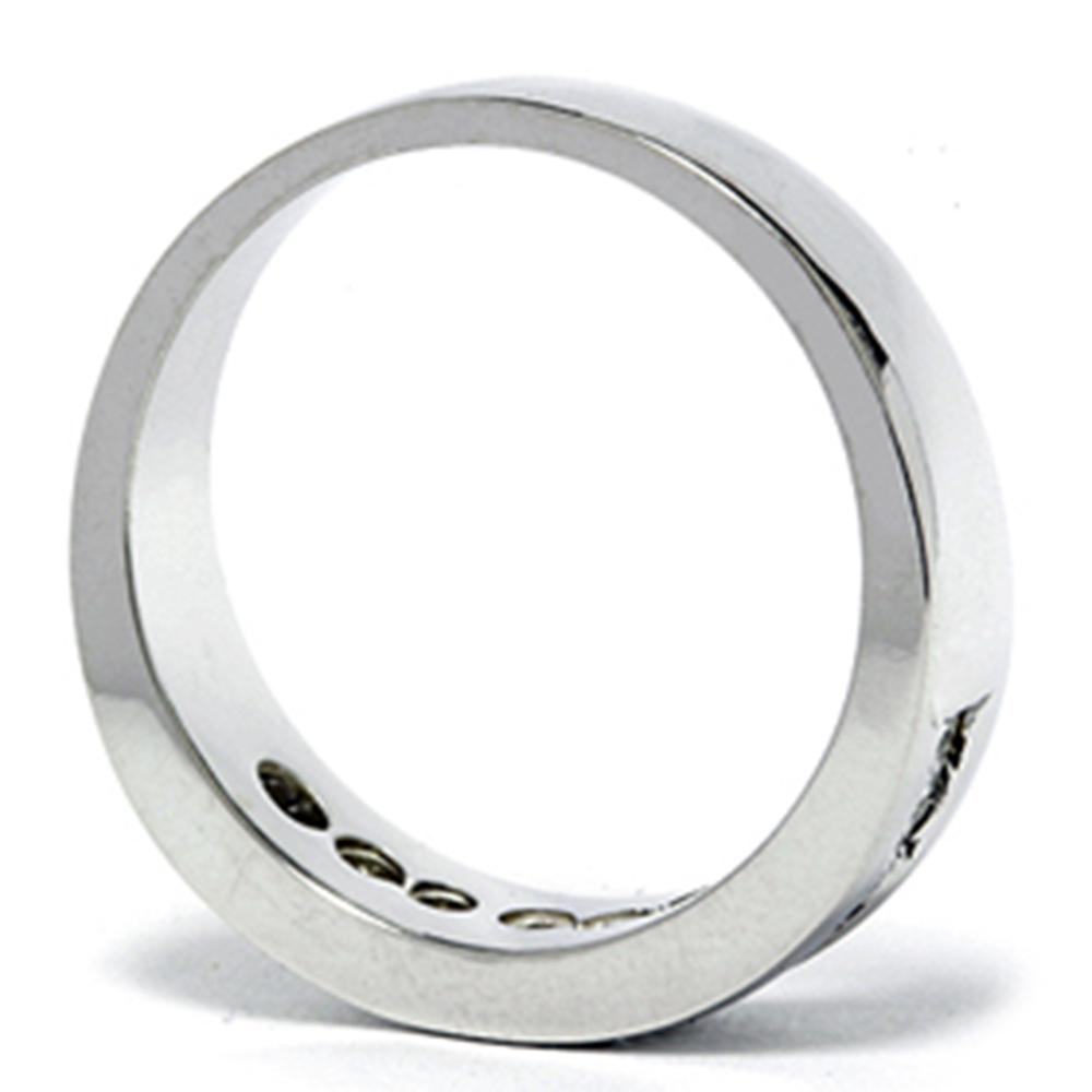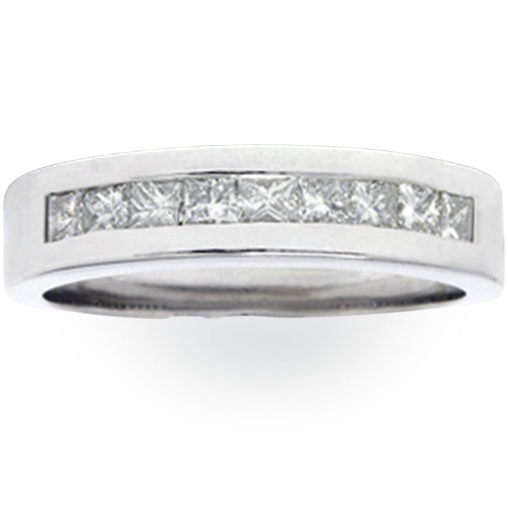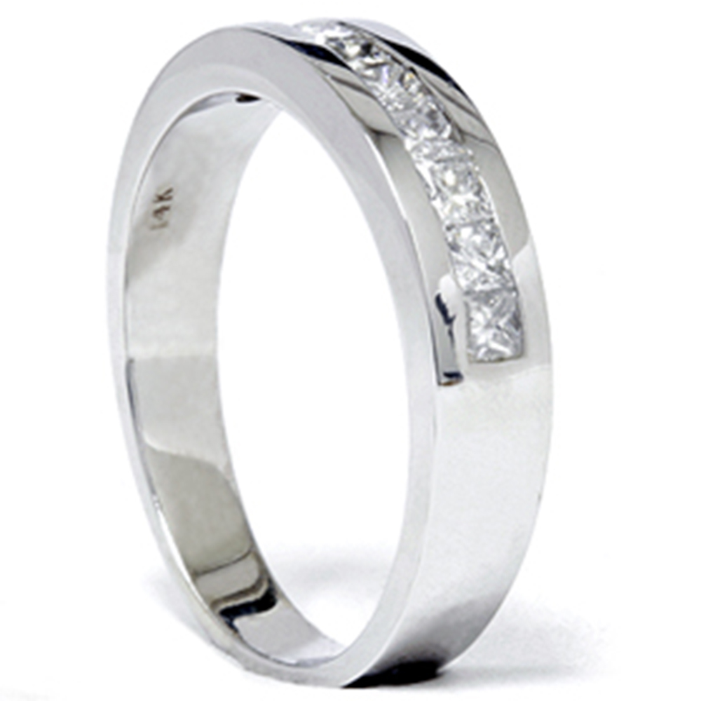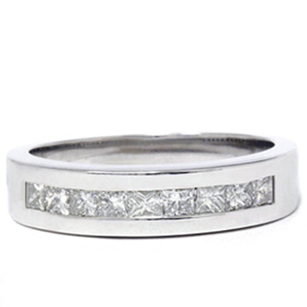 This classic men's diamond wedding ring features 9 princess square cut natural diamonds. All stone are channel set in a heavy solid 14k white gold ring.