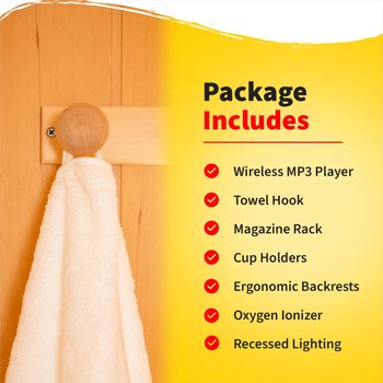 - ACCESSORIES INCLUDED: Complete with chromotherapy lighting, recessed lighting, towel hooks, magazine rack, cup holder, oxygen ionizer, air vents, and 2 ergonomic indoor sauna backrests for comfort. Includes an easy-to-assemble buckle system for quick setup.