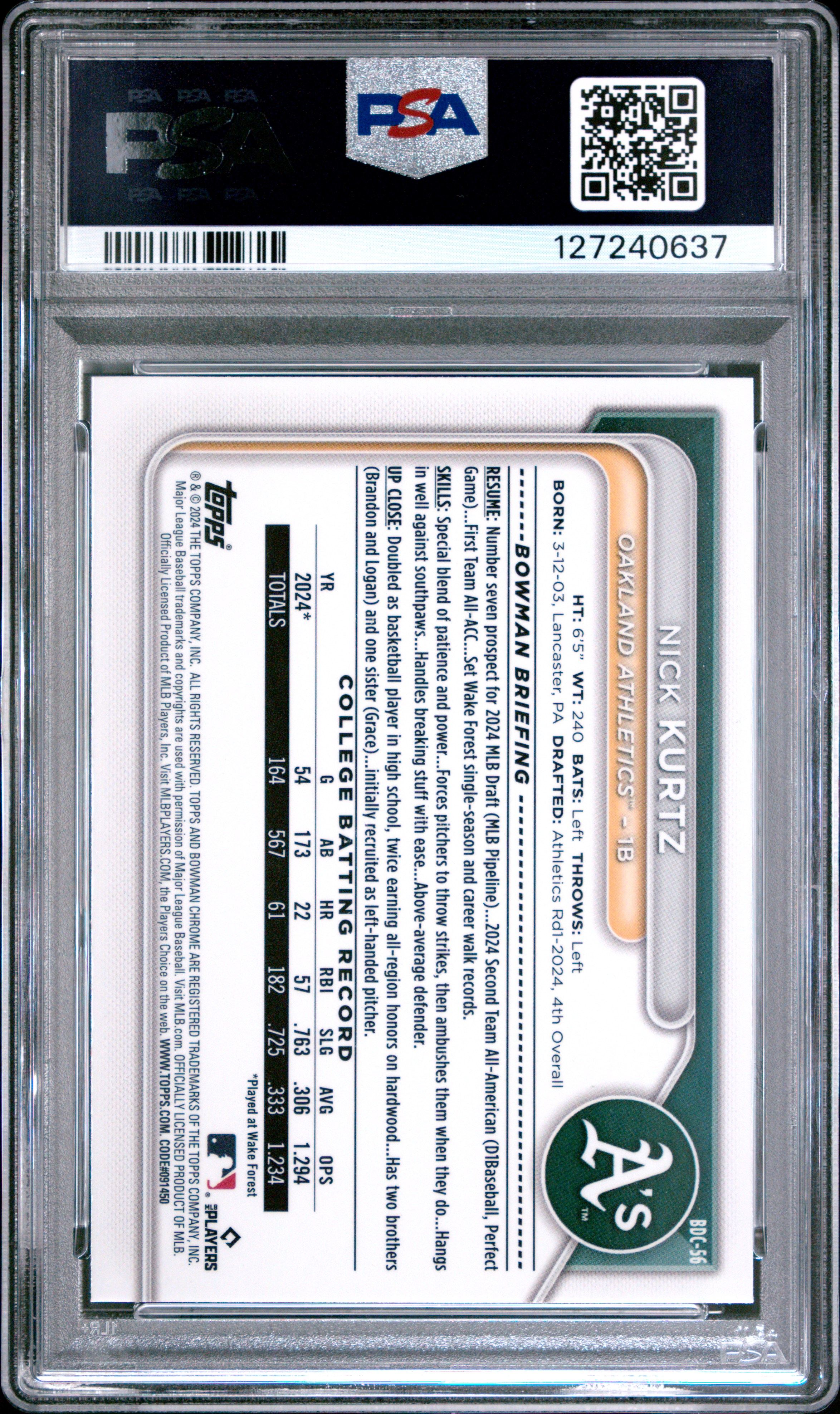 2024 Bowman Chrome Draft Nick Kurtz PSA 10 Athletics #BDC56
