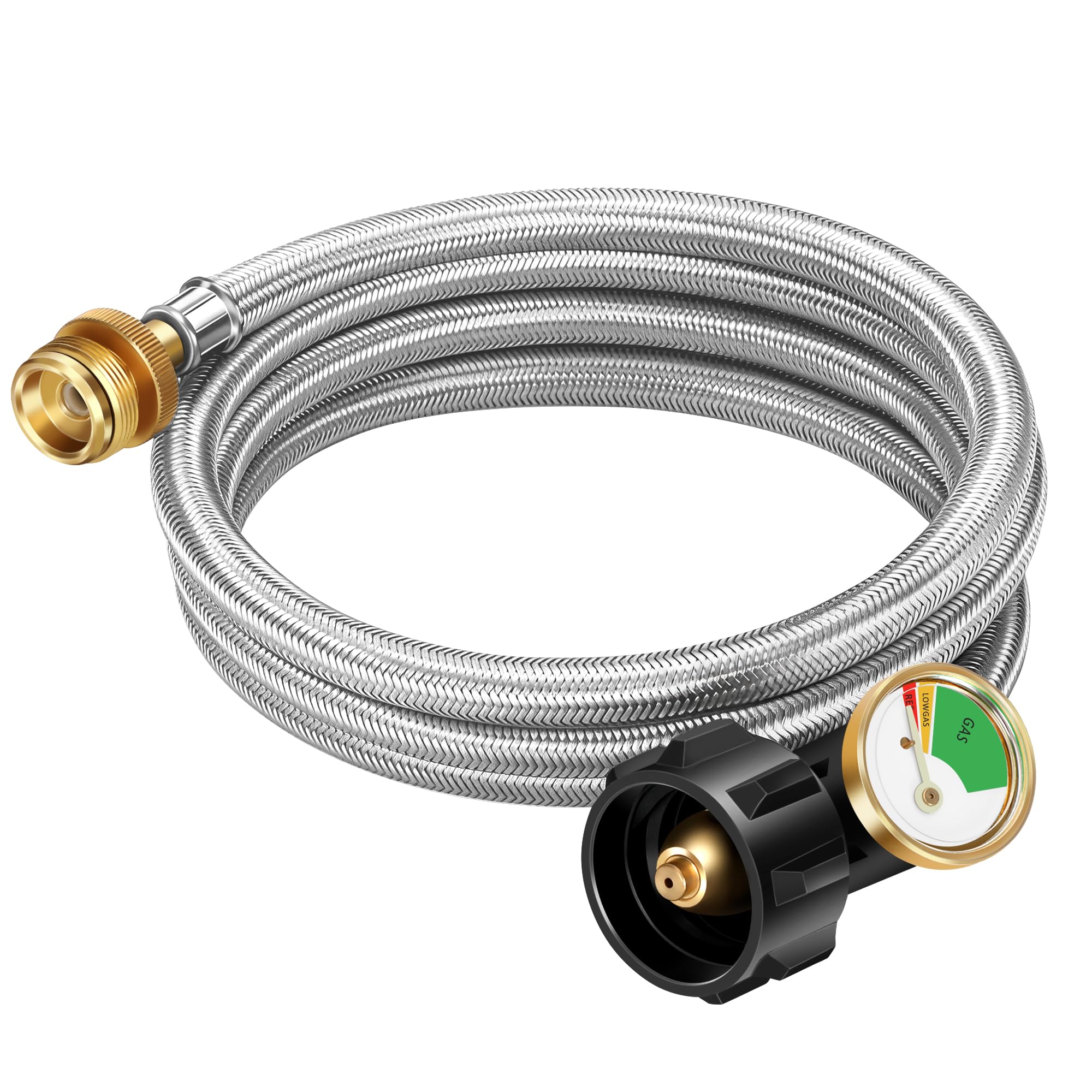 Stainless steel braided propane hose adapter -more effective than rubber hose to withstand bad weather and prevent animals from chewing. 100% solid brass joint with rubber sealing gasket inside to prevent leakage