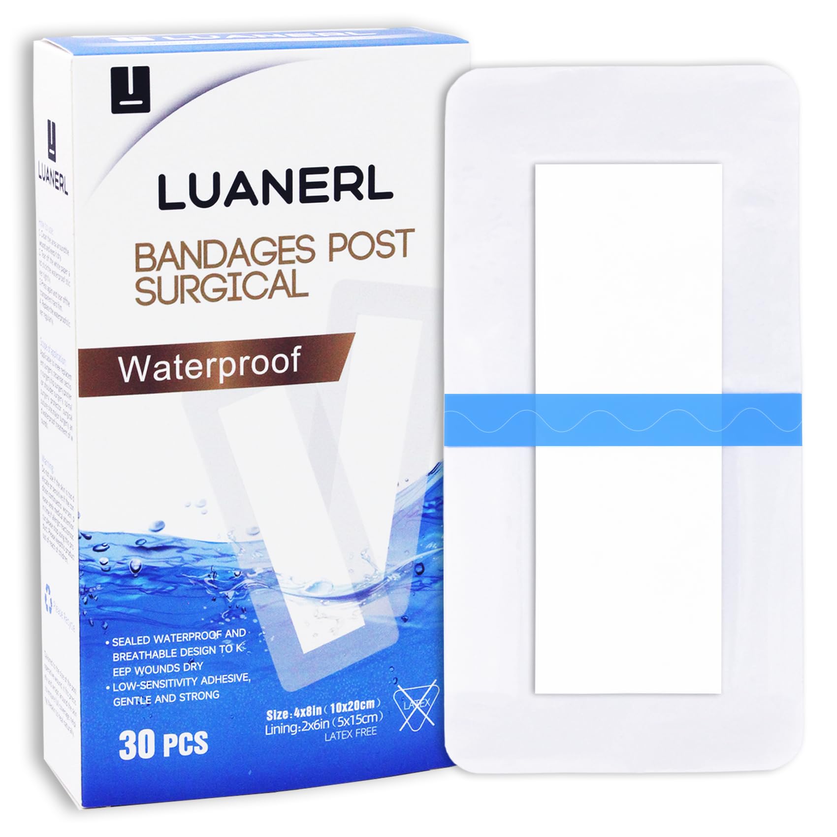30 Pack 4"x8" Waterproof Adhesive Island Dressing for Post-Surgery Recovery Sterile Bordered Gauze Bandages with Non-Stick Pad for Knee/Hip Replacement, Surgical Incision Care & Shower Protection WATERPROOD WOUND PROTECTION (4 x 8 INCH SIZE) Full-coverage waterproof seal blocks water and bacteria with 10 x 20 centimeter medical-grade barriers; tested for thirty minutes of shower safety; quick-dry surface prevents moisture buildup to reduce infection risks HIGH-ABSORBENCY SOFT CORE ( 2 x 6 INCH PAD) Non-stick inner layer absorbs up to five milliliters of fluid daily; widened antimicrobial zone protects 5 x 15 centimeter sensitive areas; reduces friction and irritation from clothing or bedding JOINT-FRIENDLY COMFORT FOR ACTIVE RECOVERY Zero point two centimeter ultra-thin material bends one hundred twenty degrees with knee or hip movement; hypoallergenic adhesive stays secure during walking or sitting; gentle removal without pulling skin or hair MULTI-SURGERY APPLICATION Designed for long incisions from hip replacements, knee surgeries, spinal procedures, and pacemaker sites; compatible with breast, shoulder, or cervical incisions; daily shower protection for four to six week recovery periods SUSTAINABLE THIRTY-PACK VALUE Thirty dressings cover four weeks of daily changes; recyclable packaging cuts plastic waste by seventy percent; no bulky gauze or tape needed—apply and remove like a standard bandage