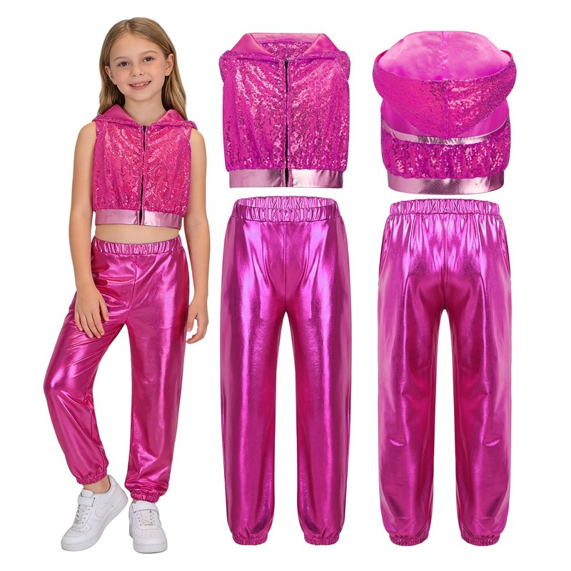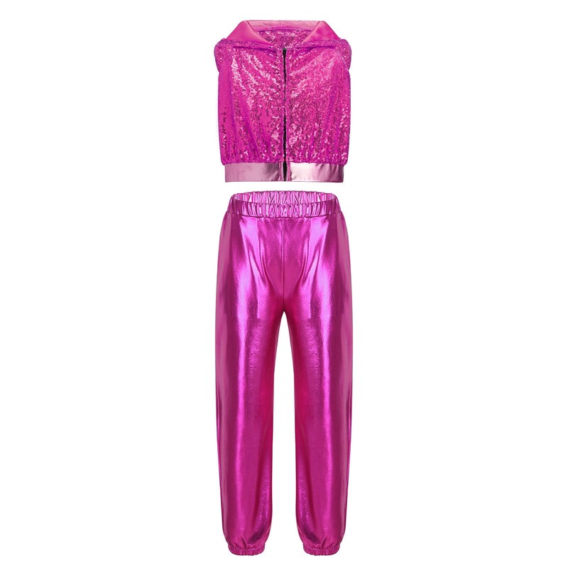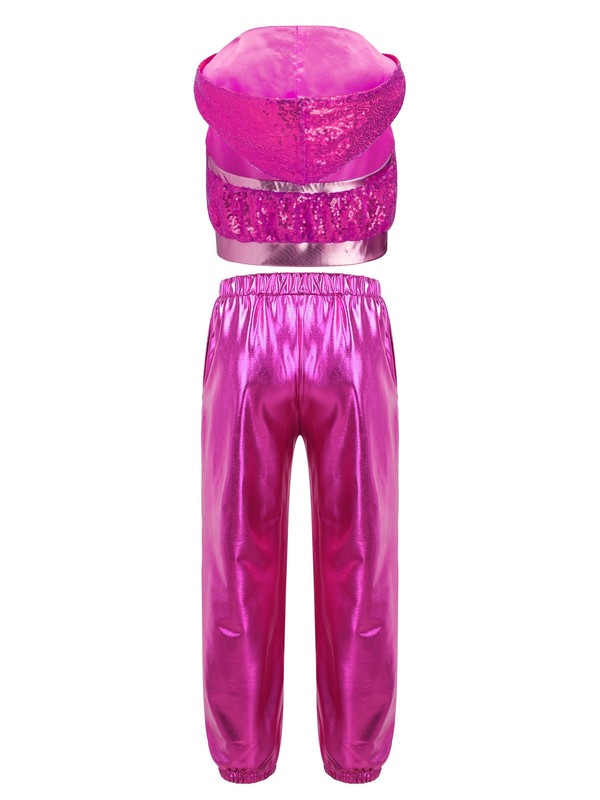 The sparkling sequins on the hooded crop-top bring a glamorous and eye-catching effect, in line with the hip-hop and jazz dance aesthetic.