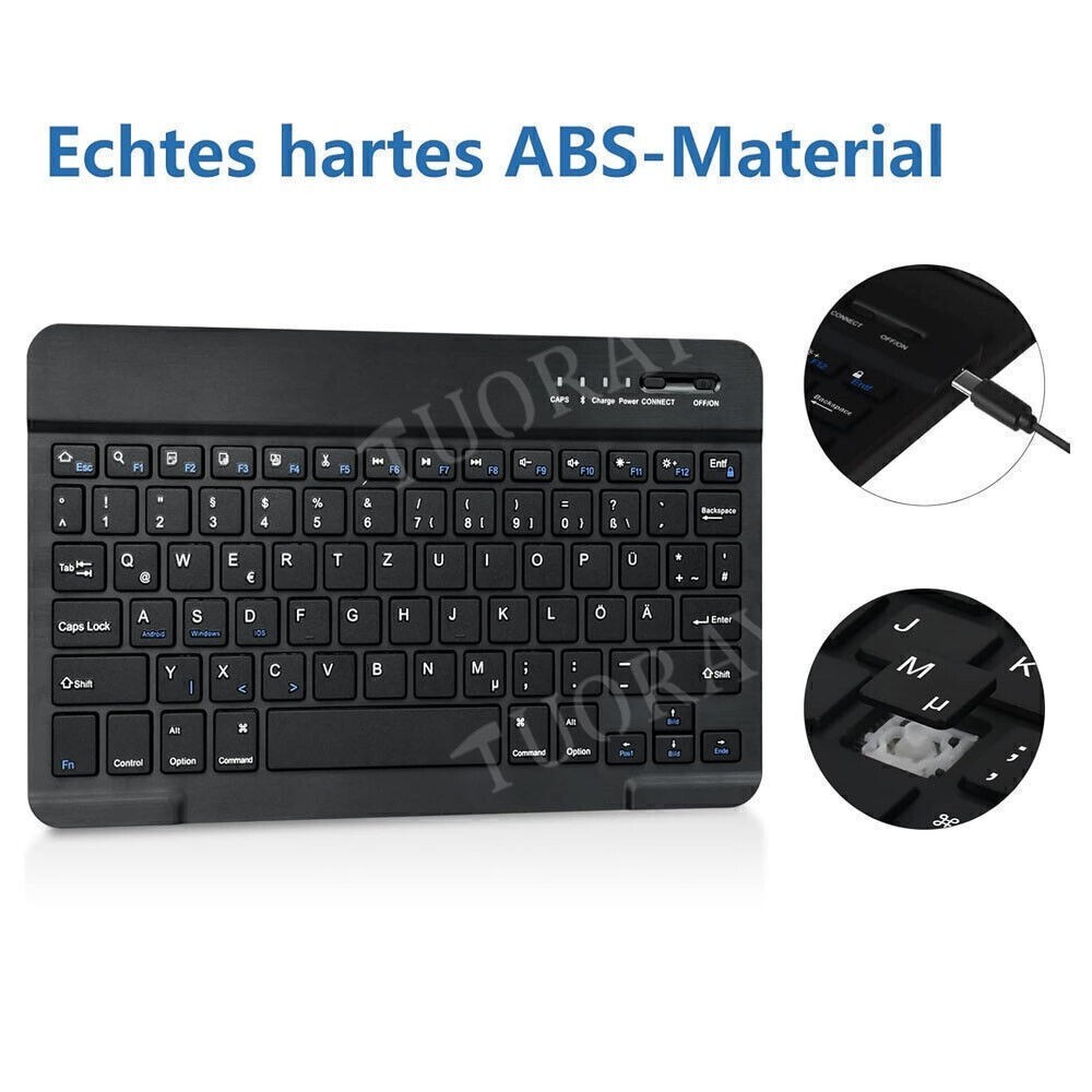 【Tragbare kabellose Tastatur】 ABS-Material, fingerabdruckfrei und kratzfest; leichtes und dünnes, kabelloses Bluetooth-Design, sodass Sie es problemlos in Ihren Rucksack oder Ihr Gepäck stecken können. Die Tastatur ist mit dem iPad kompatibel, sodass Sie jederzeit wie mit einem Laptop arbeiten können.