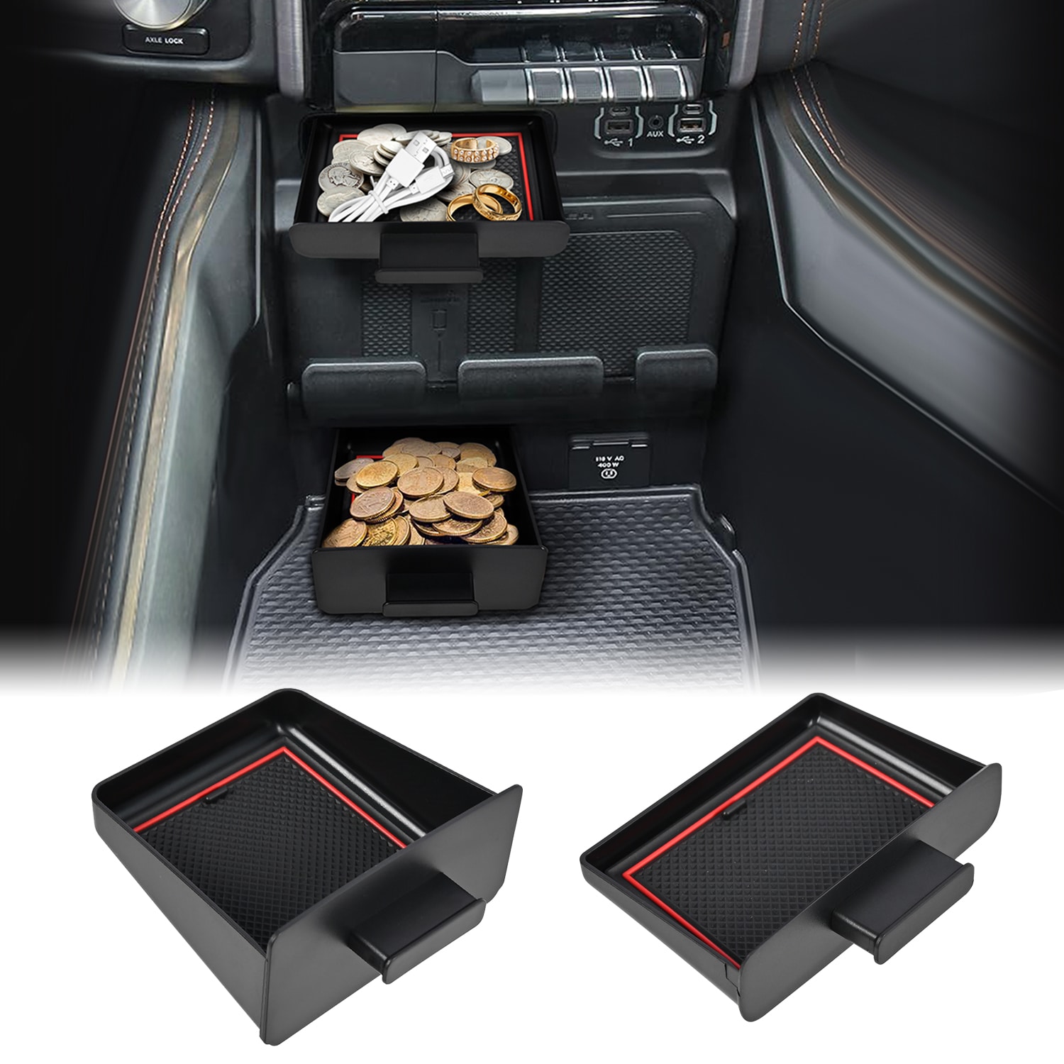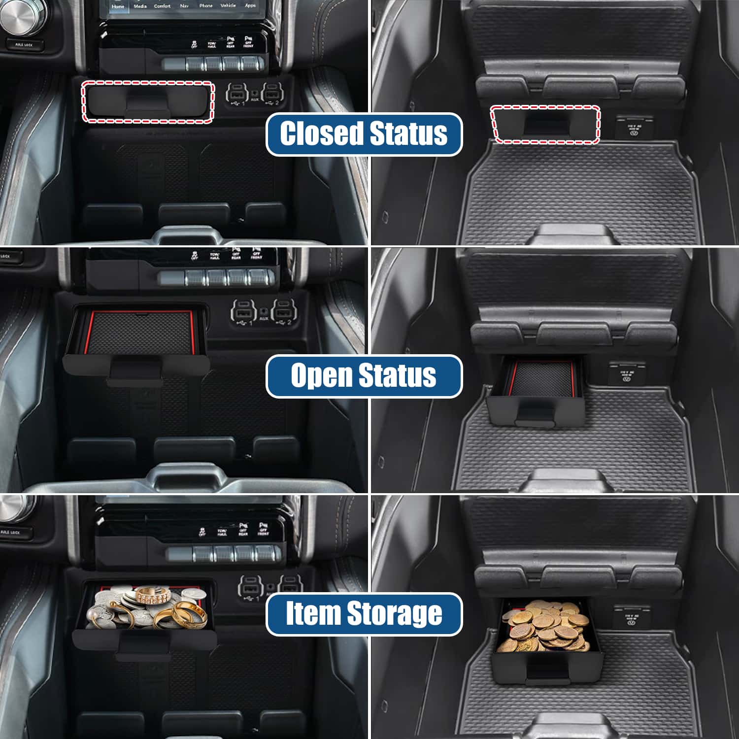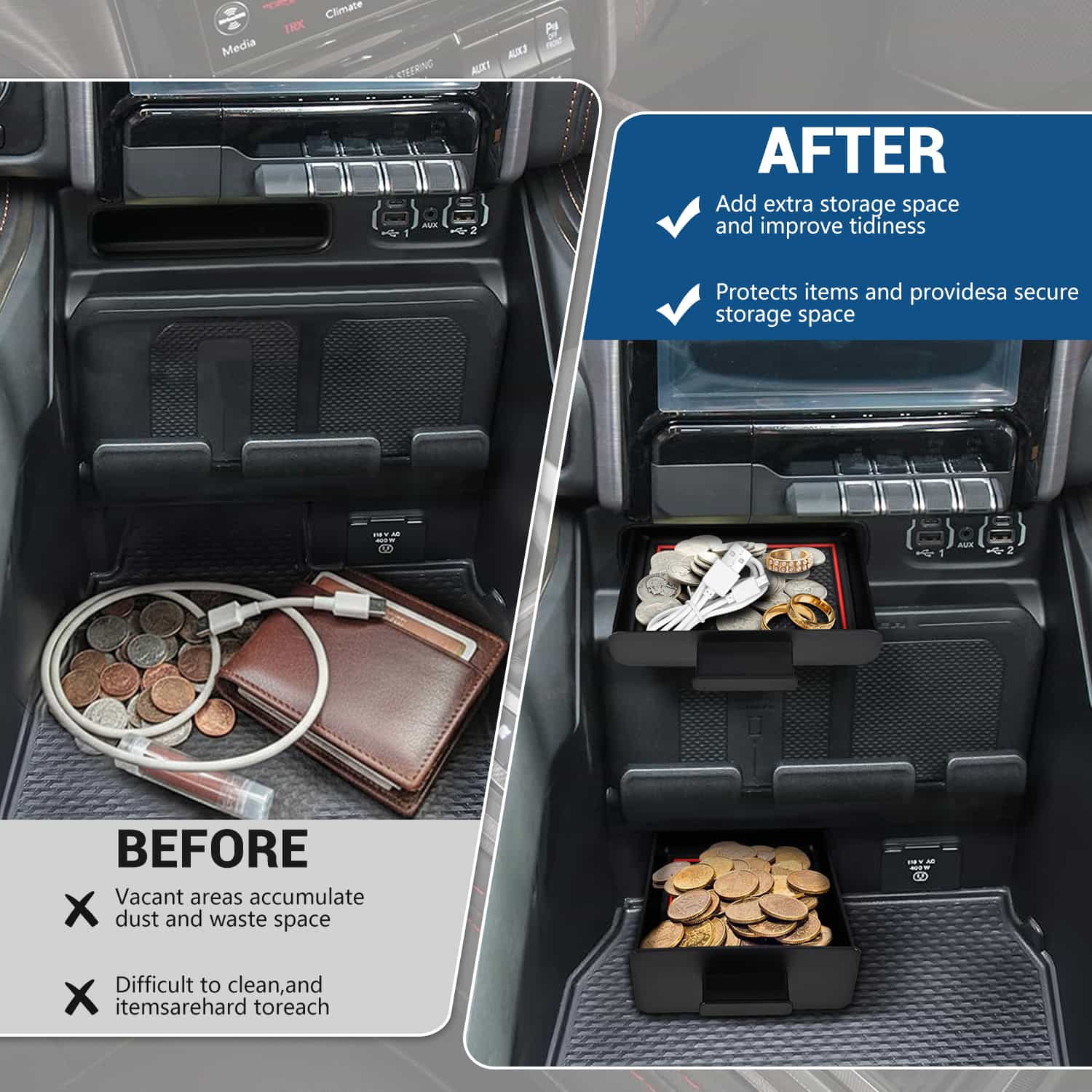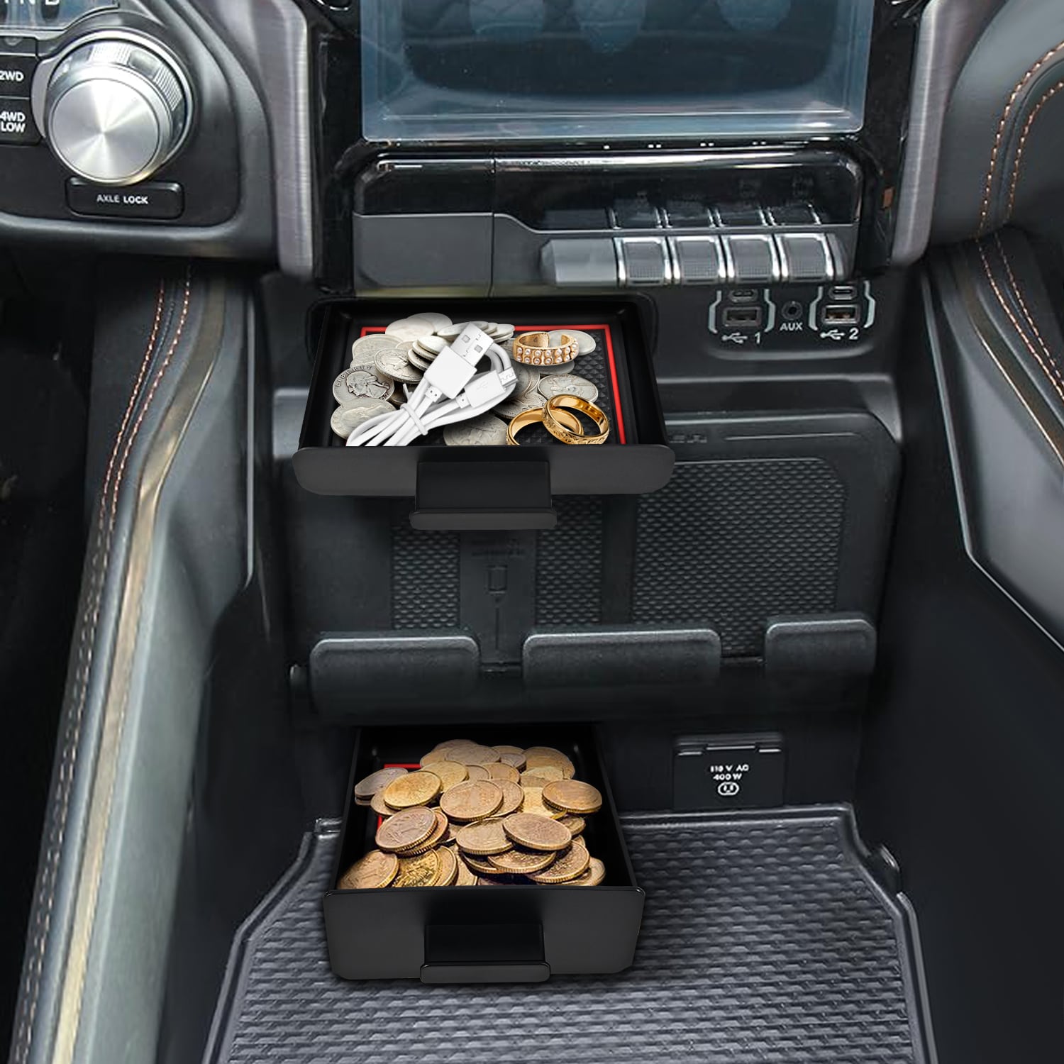 Transforms unused storage compartments into practical space for organizing coins and small items. Fills interior gaps to create a more complete and tidy truck interior.