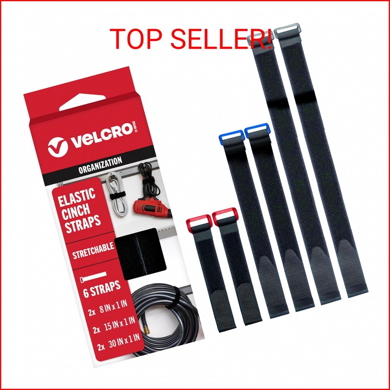 VELCRO Brand VEL-30794-AMS Elastic Cinch Straps with Buckle | 6pc Variety Pack 8"-15"-30"| Stretchable to Snugly Fasten Power Cords, Lumber, Bicycles, Sleeping Bags, Outdoor Umbrellas, More | Black
