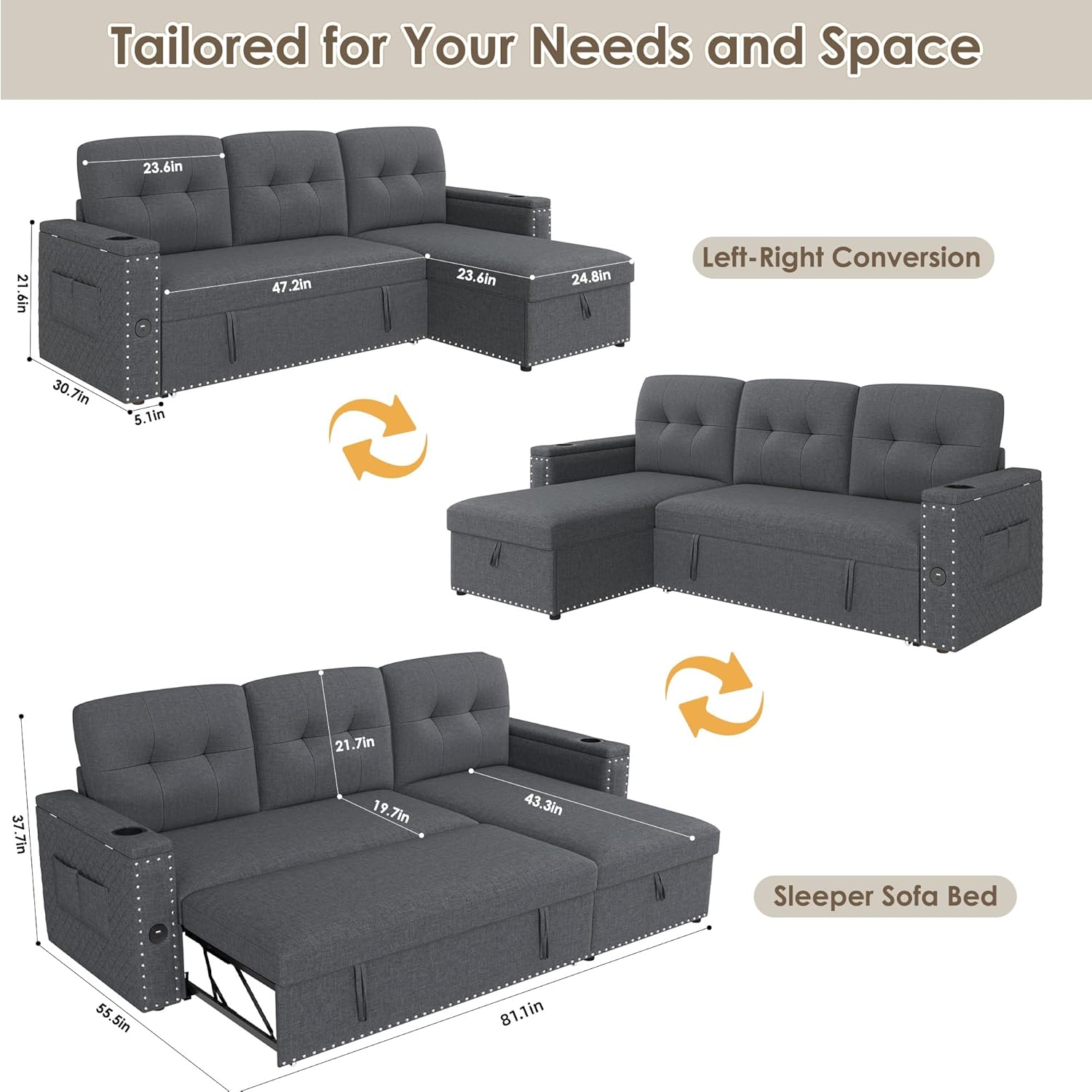 ONE-STEP CONVERS INTO A SLEEPER BED: With its pull-out strap and smooth wheels,the L shaped couch can easily transform into a sleeper sofa,crafted with a sturdy steel fre and solid wood slats,ensuring durability and a squeak-sleeping experience. This pull out couch is for acmodating overnight guests or enjoying a cozy movie night with your fily ( 1.Weight acity: 1100lbs; 2.Inner Size of Sofa Bed: 75" x 50" )