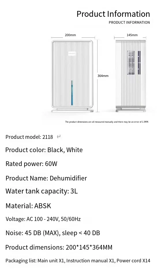 * Humidity removal:≤600ml/24h