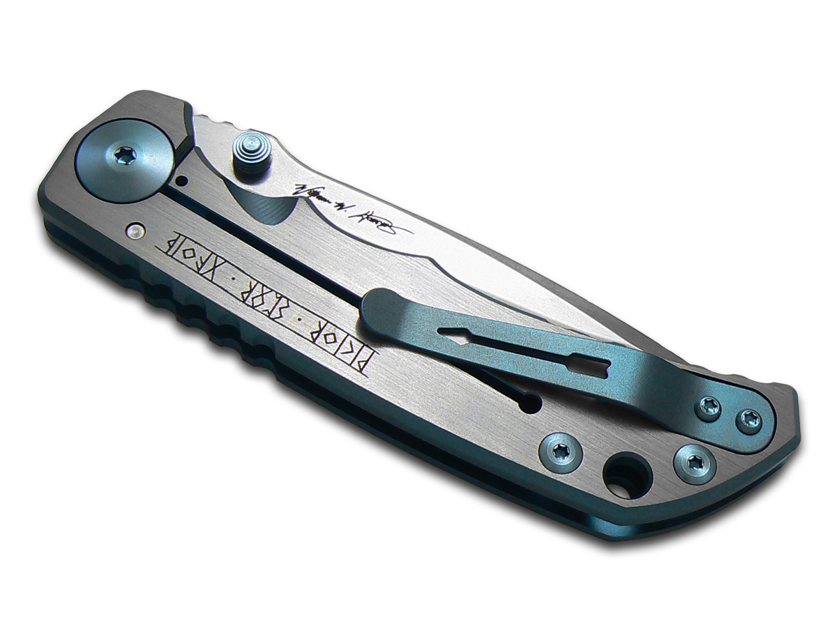 Whether you're searching for authentic cutlery to collect, a top quality knife to give as a gift, or a superior blade to carry, don't pass this one up! It comes complete with a Lifetime Limited Manufacturer's Warranty. This knife utilizes a 4" Locking Drop Point blade with a plain edge, flat grind, swedge, 3.8mm thickness, thumb studs, and thumb ramp jimping. The blade material is 'Double Deep' Cryo-treated CPM MagnaCut Stainless Steel (61-63 HRC) with a Stonewashed finish and William W. Harsey signature. The contoured handle is Blue Anodized 6AL4V Titanium with Satin flats, Blue hardware, jimping, lanyard hole, reversible tip-up pocket clip, and is deeply engraved with blue Viking 'Trail Walker' Runes on both sides. This magnificent piece is 4 3/4 inches long(closed for folding knives) and weighs approximately 5.9 ounces. Spartan BladesĀ® was born out of a vision to create high-quality knives designed for both military and civilian use. The Spartan Blades knife company was founded in 2008 by Curtis Iovito and Mark Carey, two retired U.S. Army Special Forces NCOs with over 40 years of combined military experience. Their dedication to quality and innovation has earned them numerous Blade Show awards.