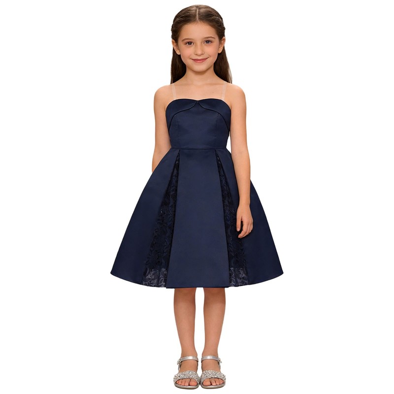 The pleated hem and floral lace panel bring in the current fashion elements, creating an elegant and sweet look for girls.