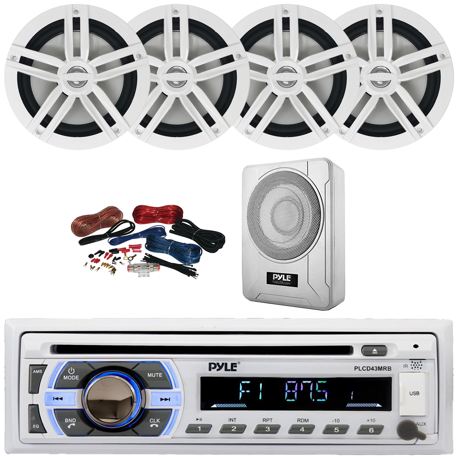Pyle PLCD43MRB Single DIN Marine Bluetooth USB/AUX MP3 Player AM/FM Radio In-Dash Head Unit Stereo Receiver, 4x 6.5" 180W Max Power 2-Way White Boat Speakers, 8” 600W Max Under-Seat Subwoofer W/Kit