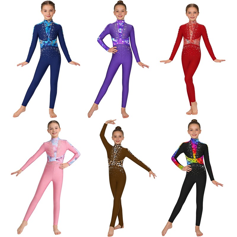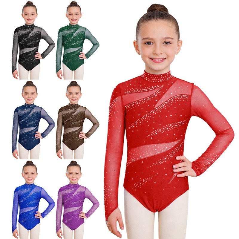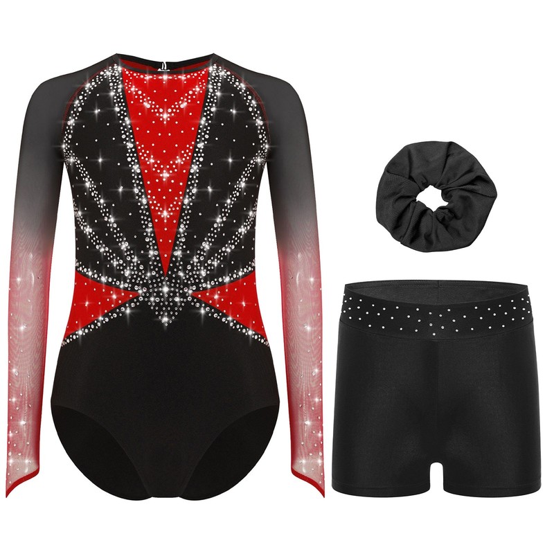 Shiny rhinestones and color-block design on the leotard bring a sense of sparkle and modernity. Come with shorts and a headwear.