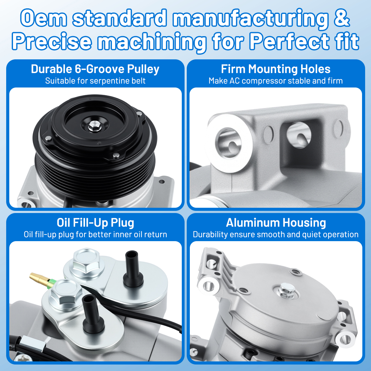 This powerful auto AC compressor can provide intense pressure to achieve strong cooling effect, and it also manifests excellent performance in dissipating heat and ventilation.Longer life of the alternator through the use of premium brushes and other critical components that resist failure or poor performance.