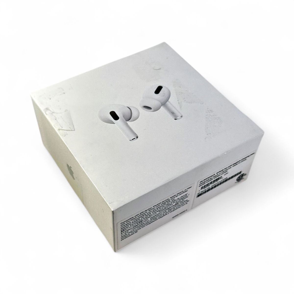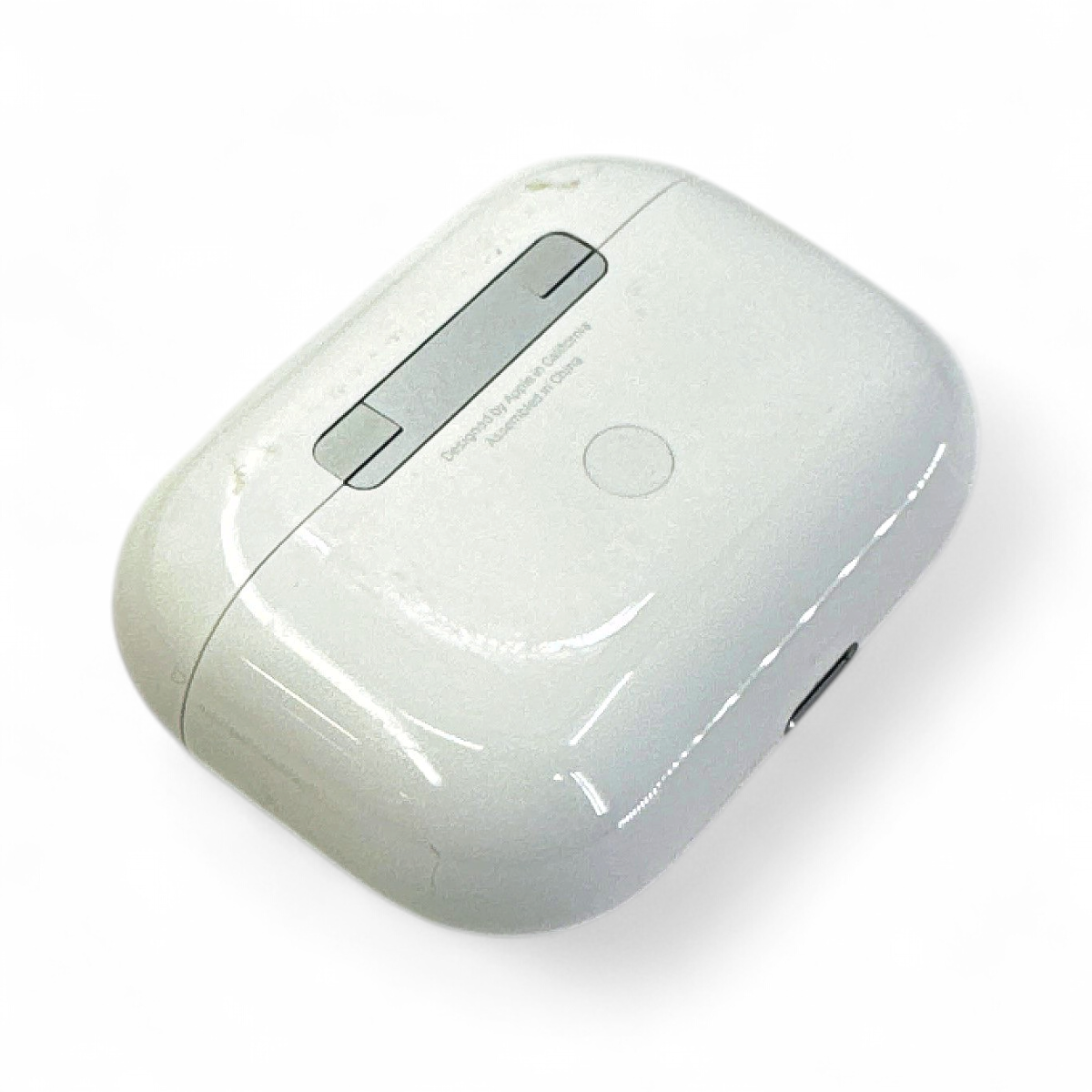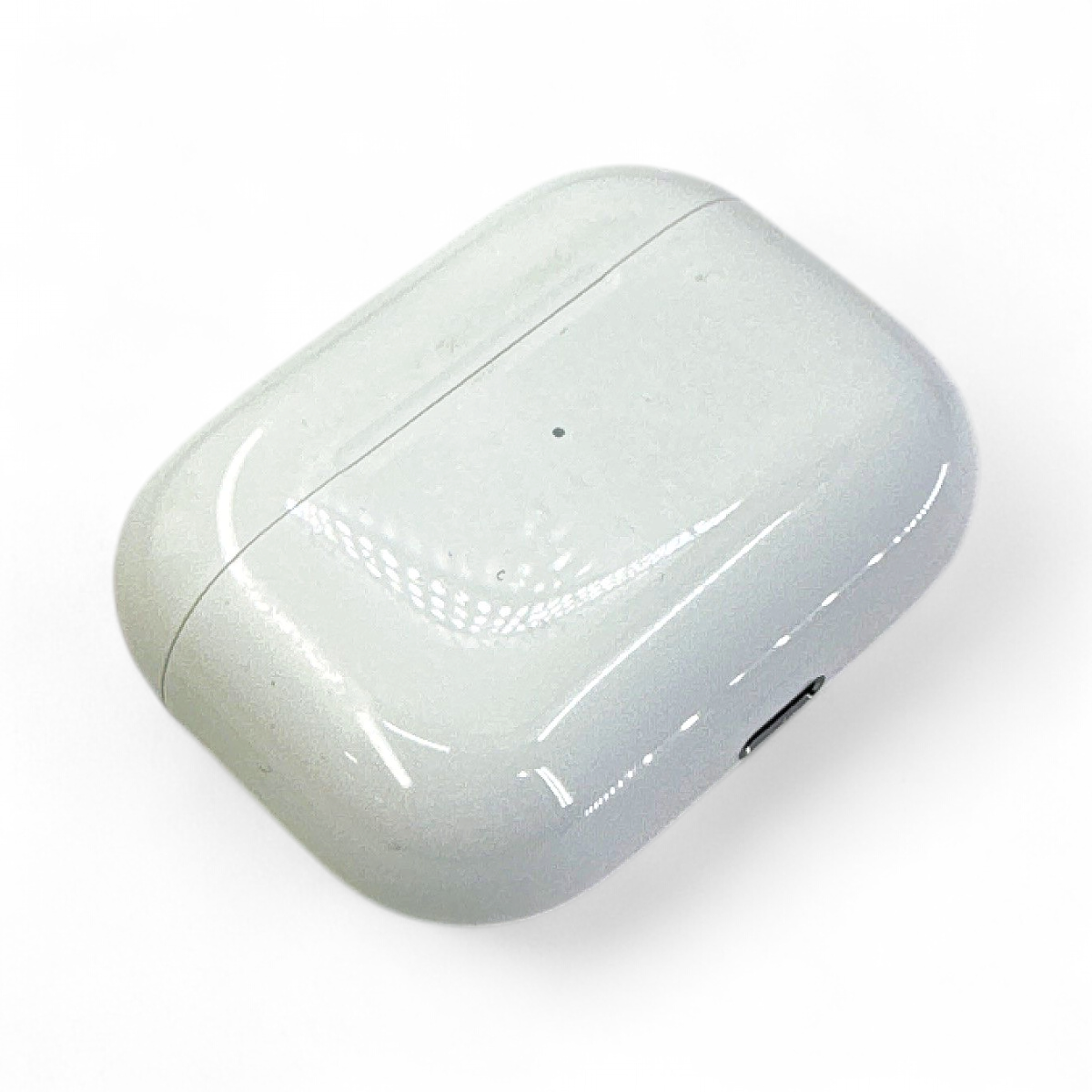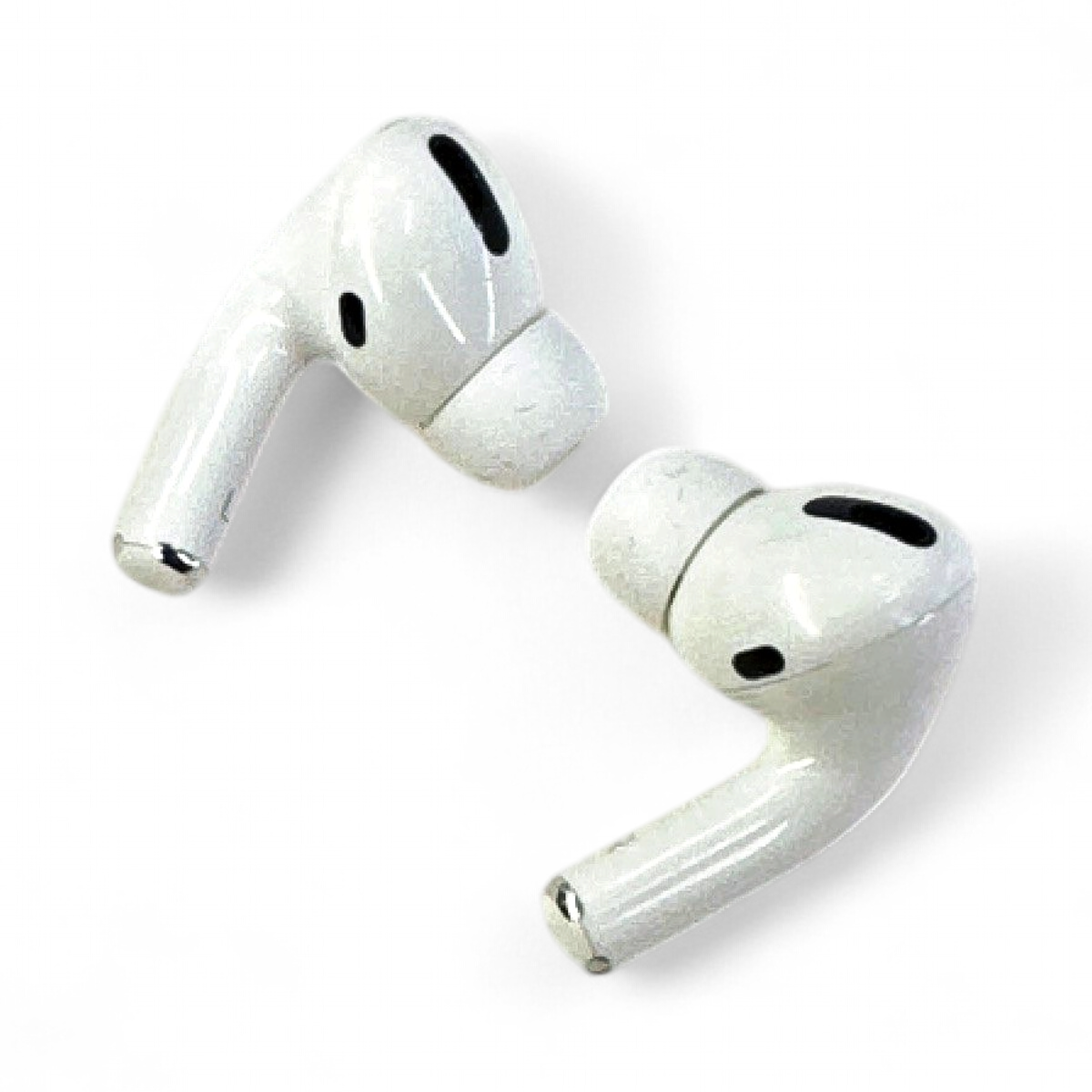 Appearance: The AirPods Pro and charging case show scratches and stains throughout, indicating signs of use.