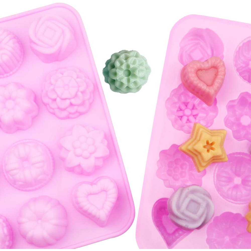 [Packaging and Dimensions] This set includes 4 small flower-shaped silicone soap molds. Each mold measures: 8.3 inches x 6.3 inches x 1 inch, and each cavity measures approximately 1.7 inches x 1 inch.